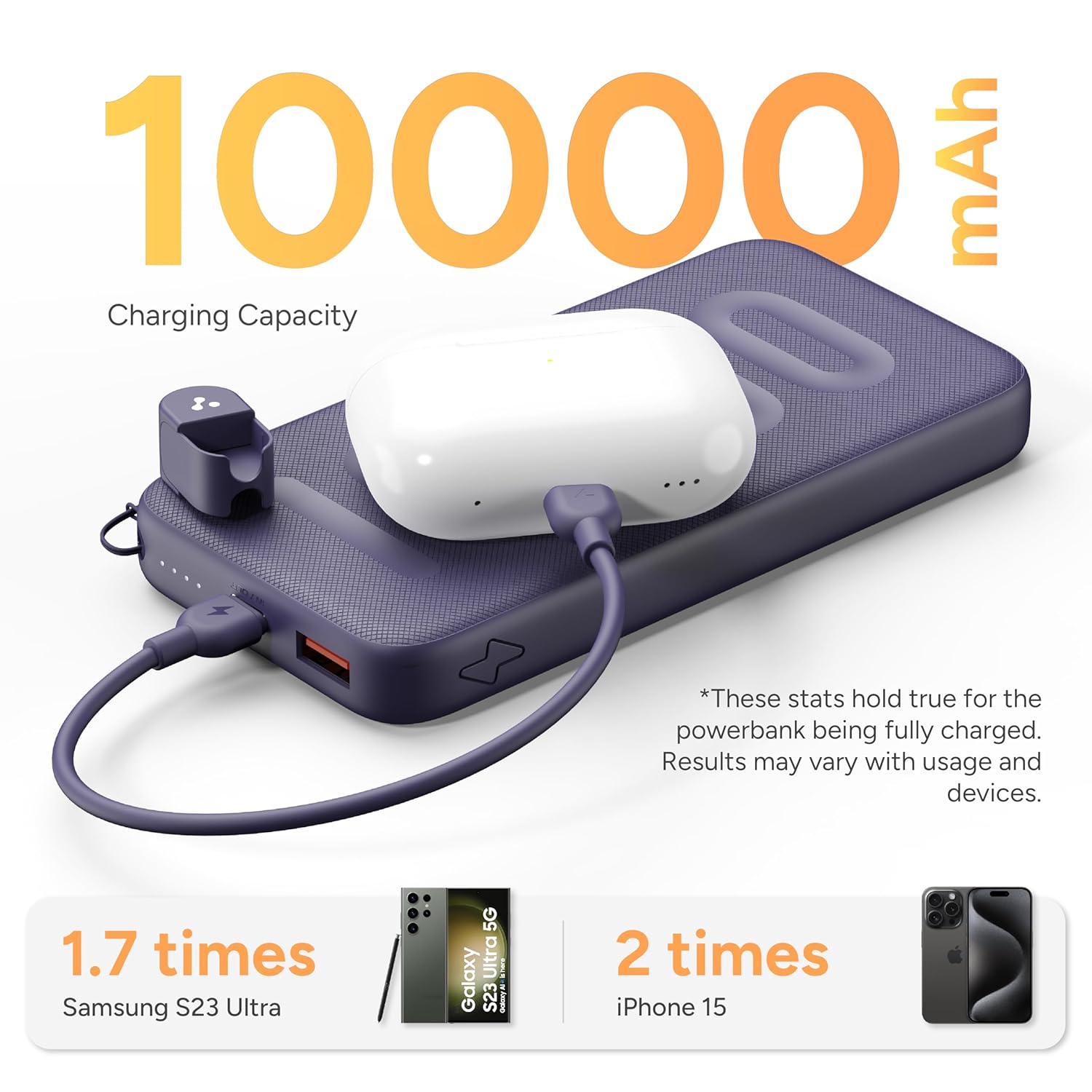 Ambrane 10000mAh Slim & Compact Powerbank with in-Build Type C Cable, 22.5W Fast Charging, USB & Type C Output, Power Delivery, Quick Charge for iPhone, Android & Tablets, Earbuds, (Stylo N10,Purple)