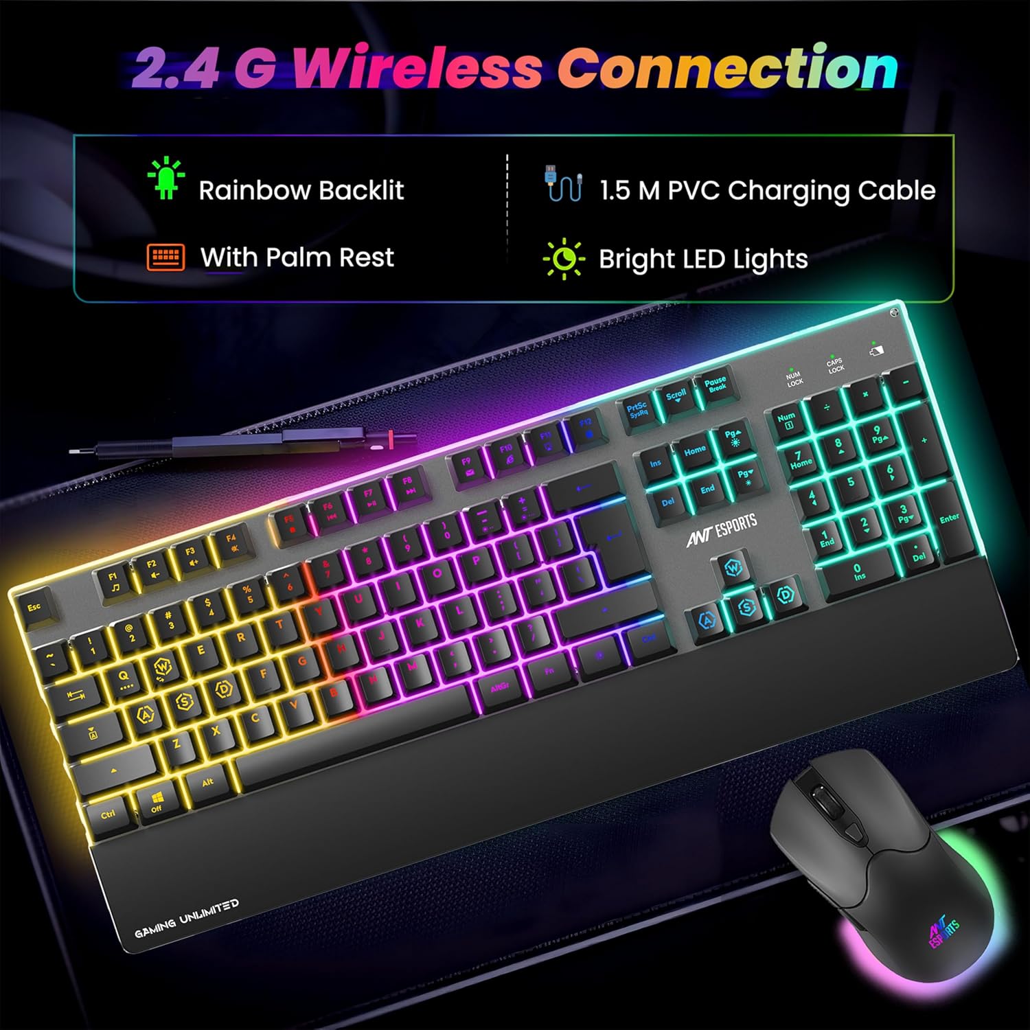 Ant Esports KM500 Pro Wireless Gaming Keyboard and Mouse Combo, LED Backlit Rechargeable 2000mAh Battery, Mechanical Feel Anti-ghosting Keyboard + 6D 3200DPI Mice for PC Gamer (Black)