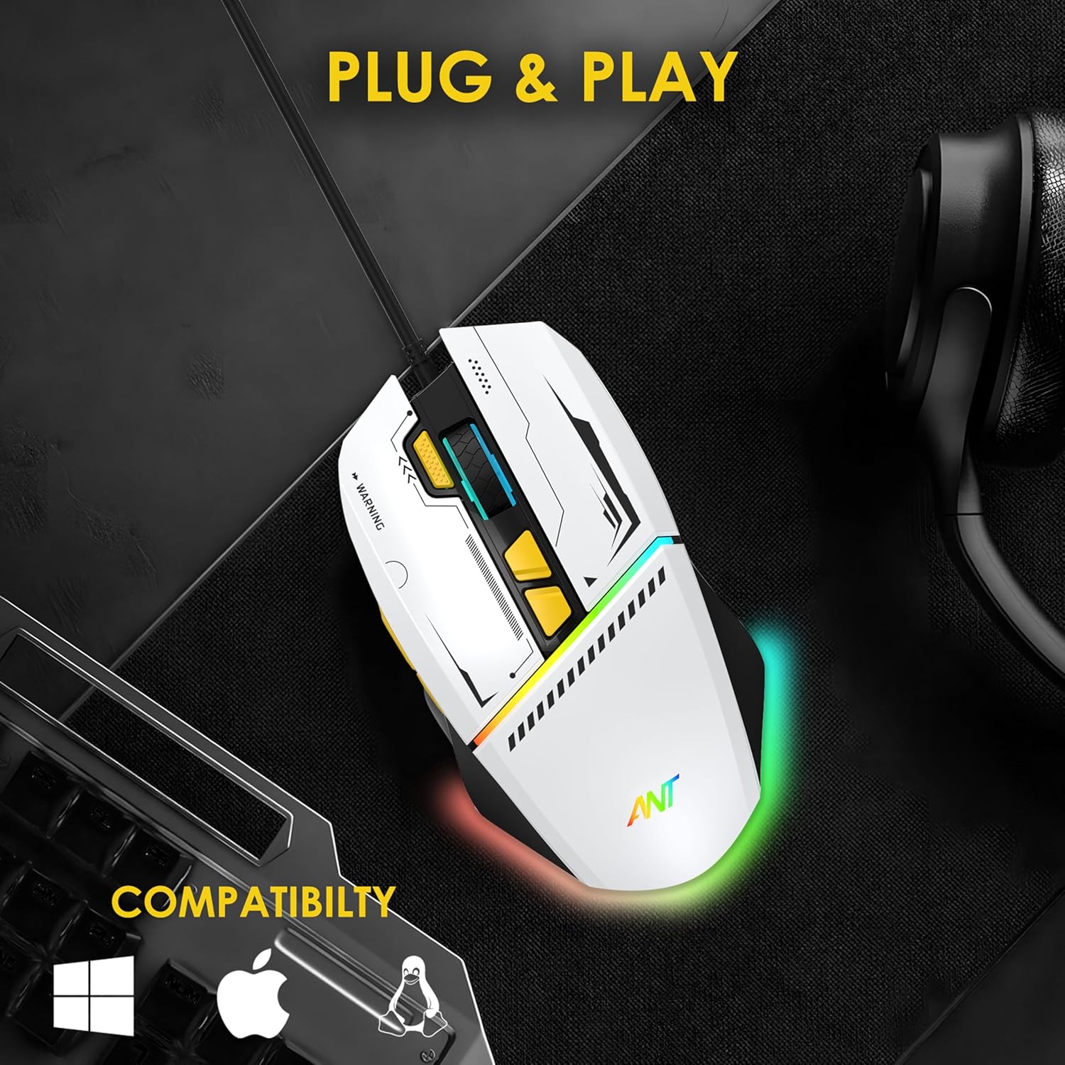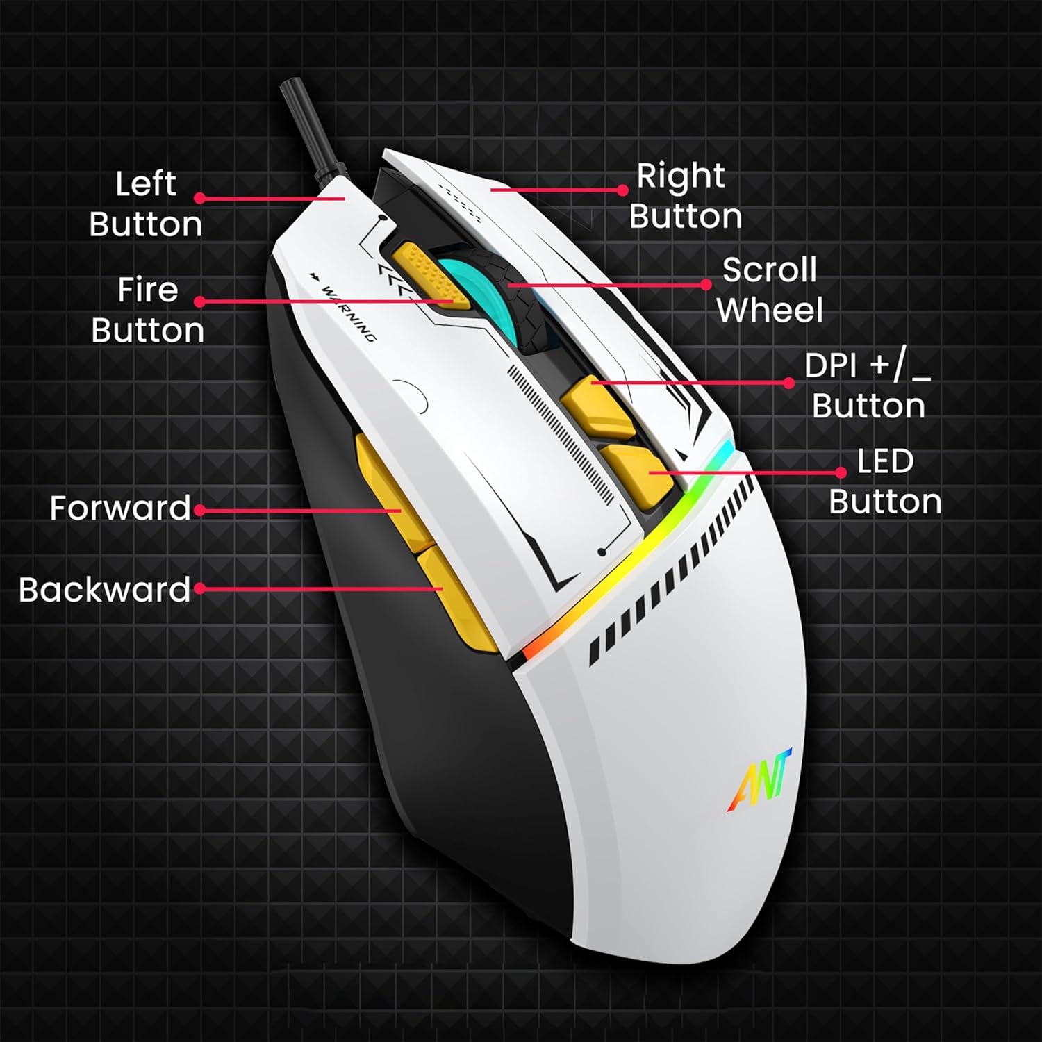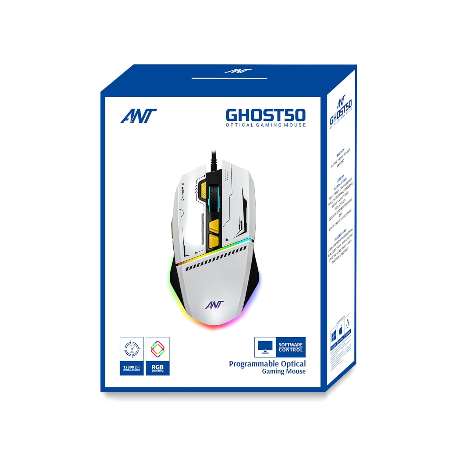 Ant Ghost 50 RGB Gaming Mouse with12800 DPI Wired Optical Gamer Mouse with 8 Programmable Buttons & Software Support DIY Key Binding Fast Fire Button 1KHz Polling Rate – White