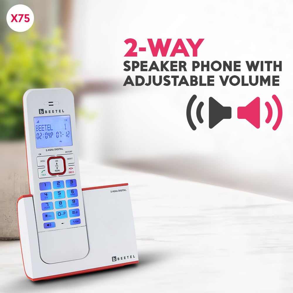 Beetel X75 2.4Ghz Cordless Landline Phone,Dual Mode DTMF/FSK,1 Line 7segment LCD Display & Blue LED Backlit,Illuminated Keypad,2 Way Speaker Phone,6 Step Ringer Volume Control(Red/White)(X75)
