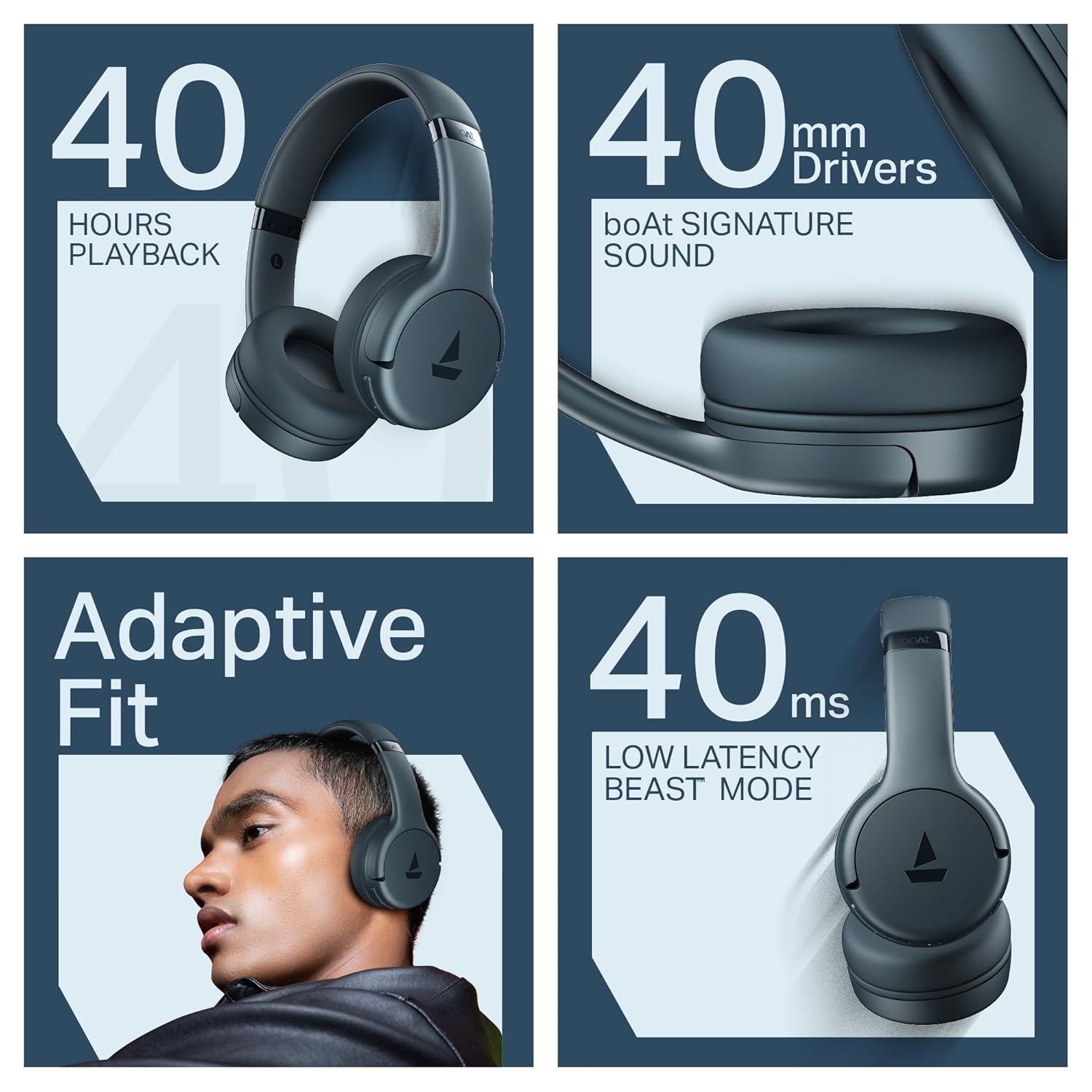 Boat 2025 Launch Rockerz 411, 40Ms Low Latency, 40Hrs Battery, 40Mm Drivers, ENx Tech, Stream Ad Free Music via App Support, Bluetooth Headphones, Wireless Over Ear Headphone with Mic (Bold Blue)