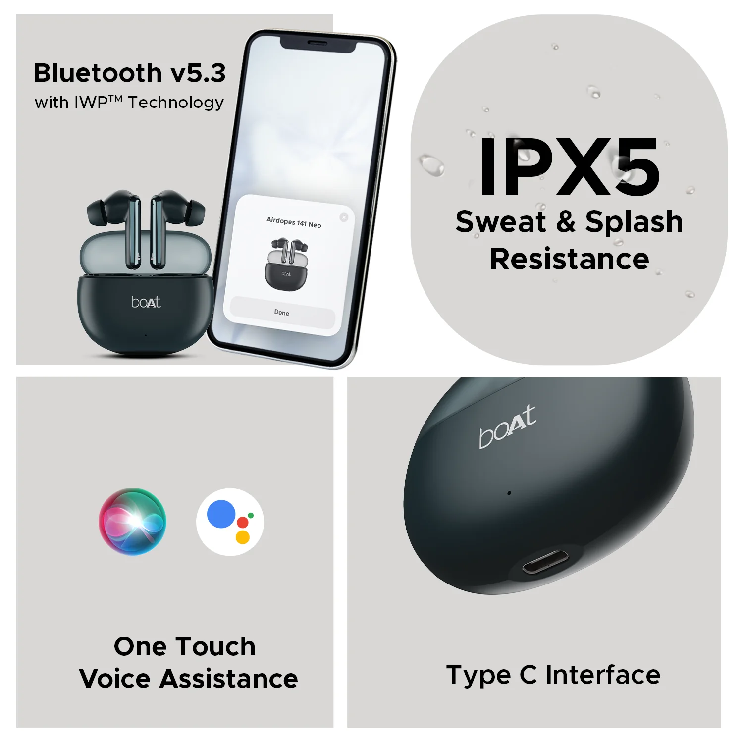 boAt Airdopes 141 Neo True Wireless Earbuds with 50 hrs Playback, BEAST™ Mode, IWP™ Tech, Signature Sound, Quad Mics with ENx™, ASAP™ Charge, USB Type-C Port & IPX5(Dragonfly Cyan)