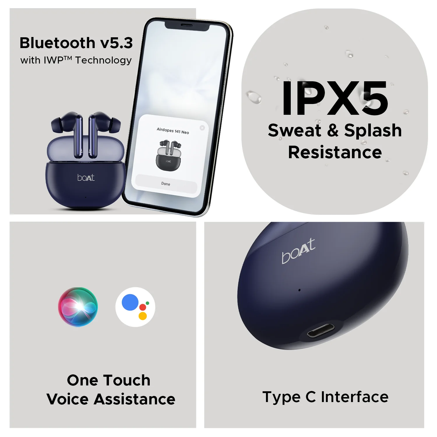 boAt Airdopes 141 Neo True Wireless Earbuds with 50 hrs Playback, Beast™ Mode, IWP™ Tech, Signature Sound, Quad Mics with ENx™, ASAP™ Charge, USB Type-C Port & IPX5(Space Blue)
