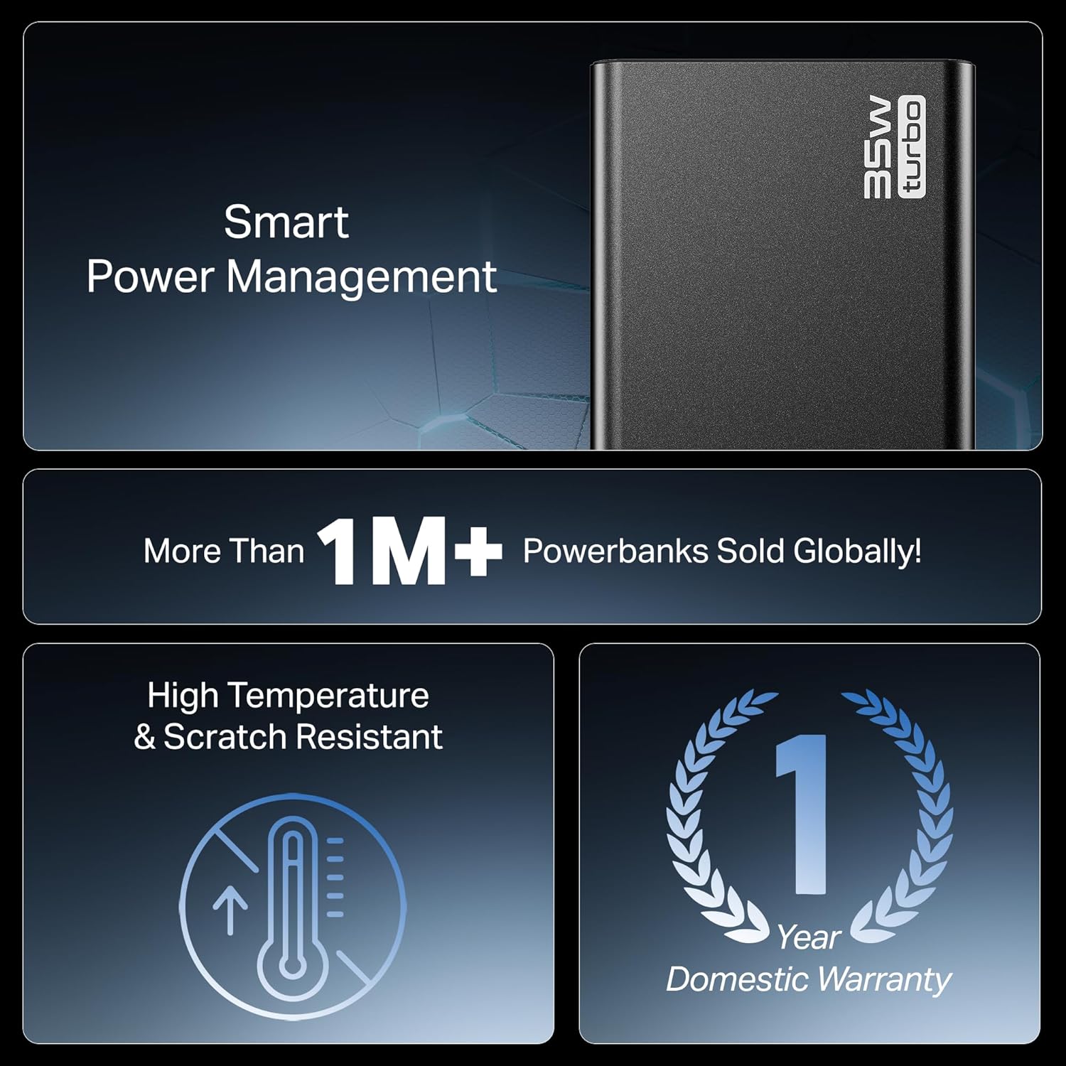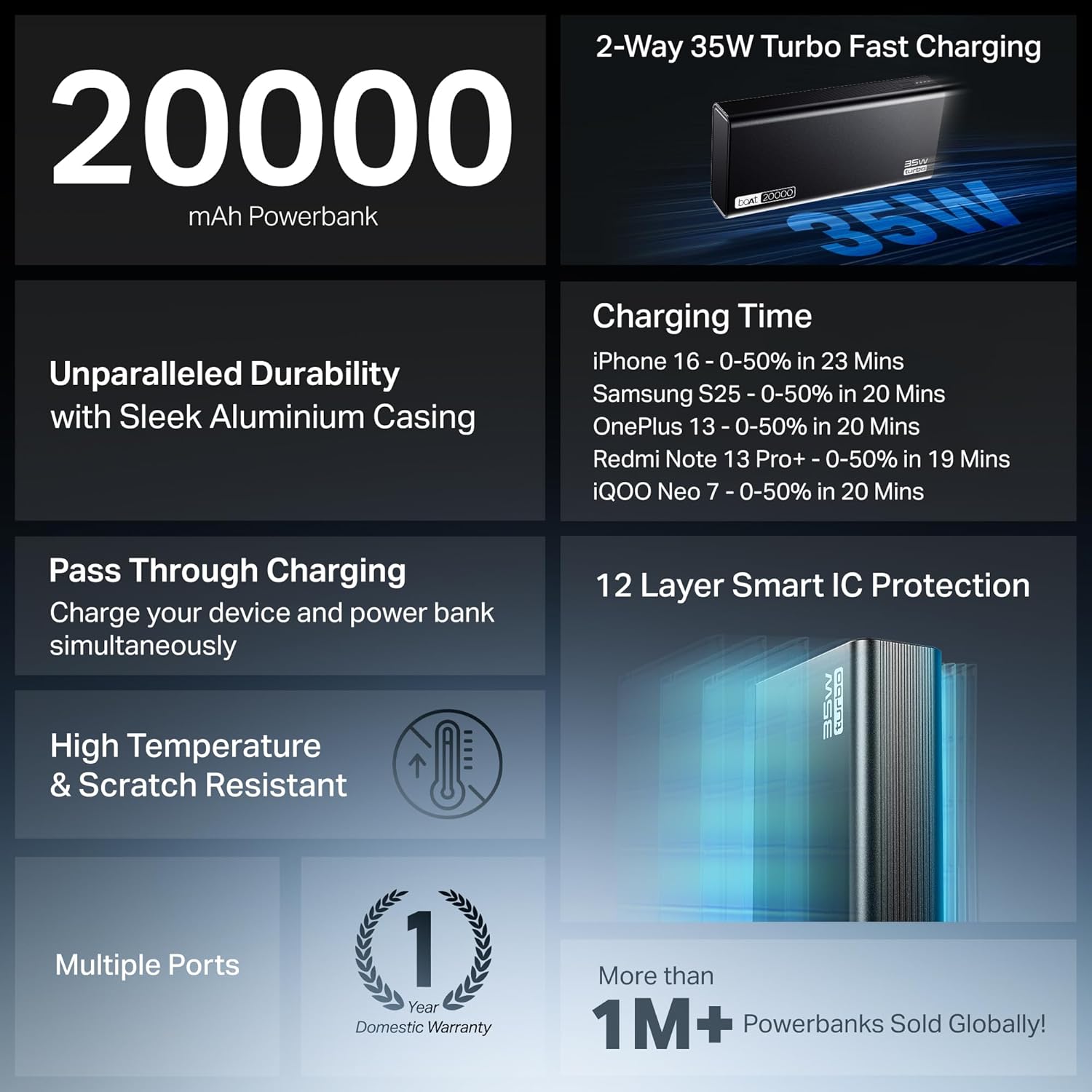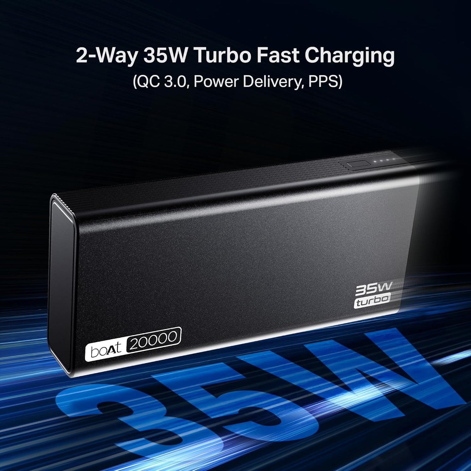 boAt Energyshroom PB435 20000 mAh 35W Super Fast Charging Power Bank, Smart 12 Layer Protection (4X Output Ports, Supports Android, iPhone, Tablets, Earbuds, etc.) (Onyx Black)
