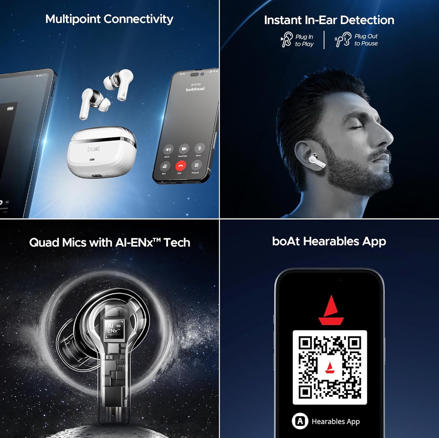 | Special Features | ‎360º Spatial Audio, Active Noise Cancellation (up to 32dB), AI-ENx™ Technology with 4 mics, Adaptive EQ, In-Ear Detection, Multipoint Connection With Google Fast Pair, BEAST Mode with 60 ms low latency, boAt Hearables App |