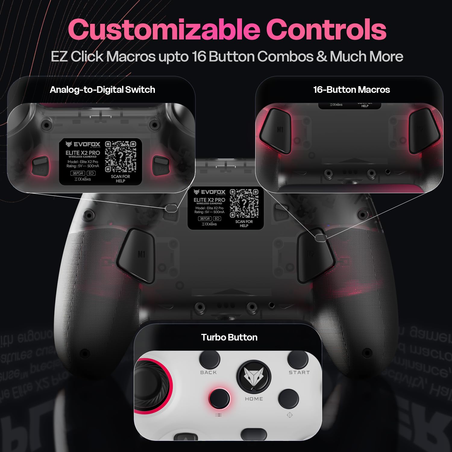 EvoFox Elite X2 Pro is a tri-mode wireless gamepad with HallSense triggers, RGB lighting, macros, precision modes, replaceable joysticks, an analog-digital switch, and multi-platform support.