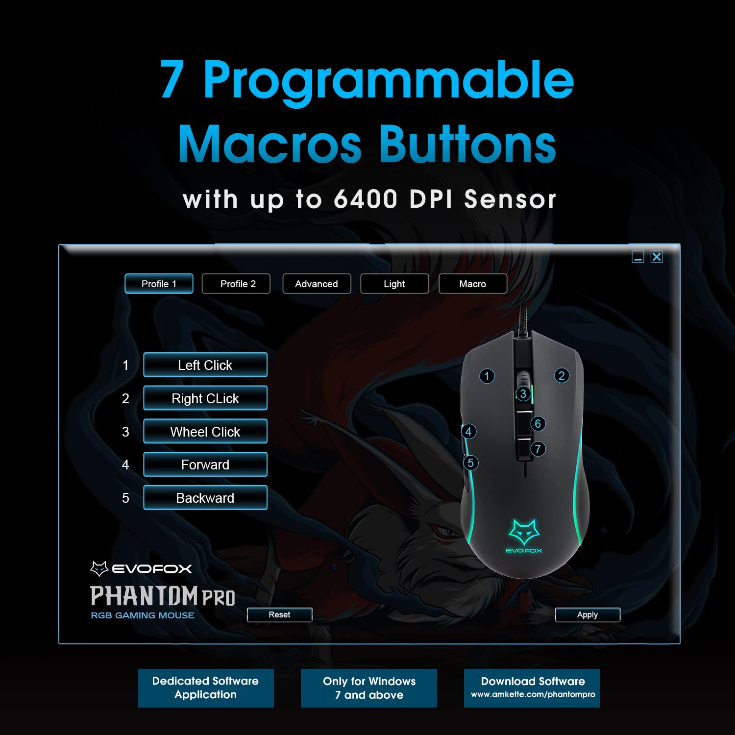 EvoFox Phantom Pro Wired Gaming Mouse with RGB and Adjustable 6400 DPI Gaming Sensor I Fully Programmable I 7 Buttons Equipped with Huano Switches I Multiple RGB Modes I 1.8M Braided Cable (Black)