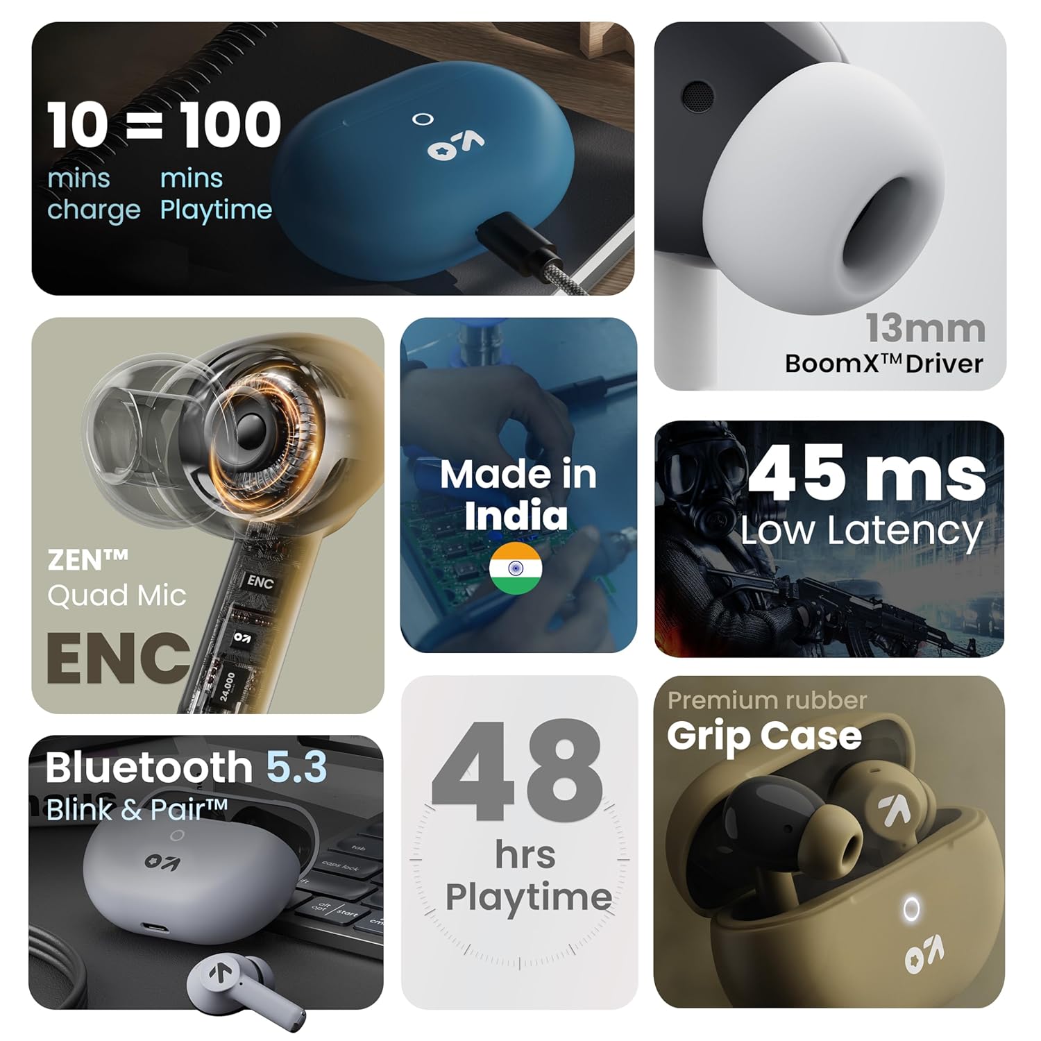 | Special Features | ‎13mm Bass Drivers, 4 ENC Calling Mics, 45ms Low Latency Gaming, 48H Playtime, Crafted in India earbuds, Fast Charging, Lightweight, Microphone Included, Noise Cancellation, Sweatproof, Touch Control |