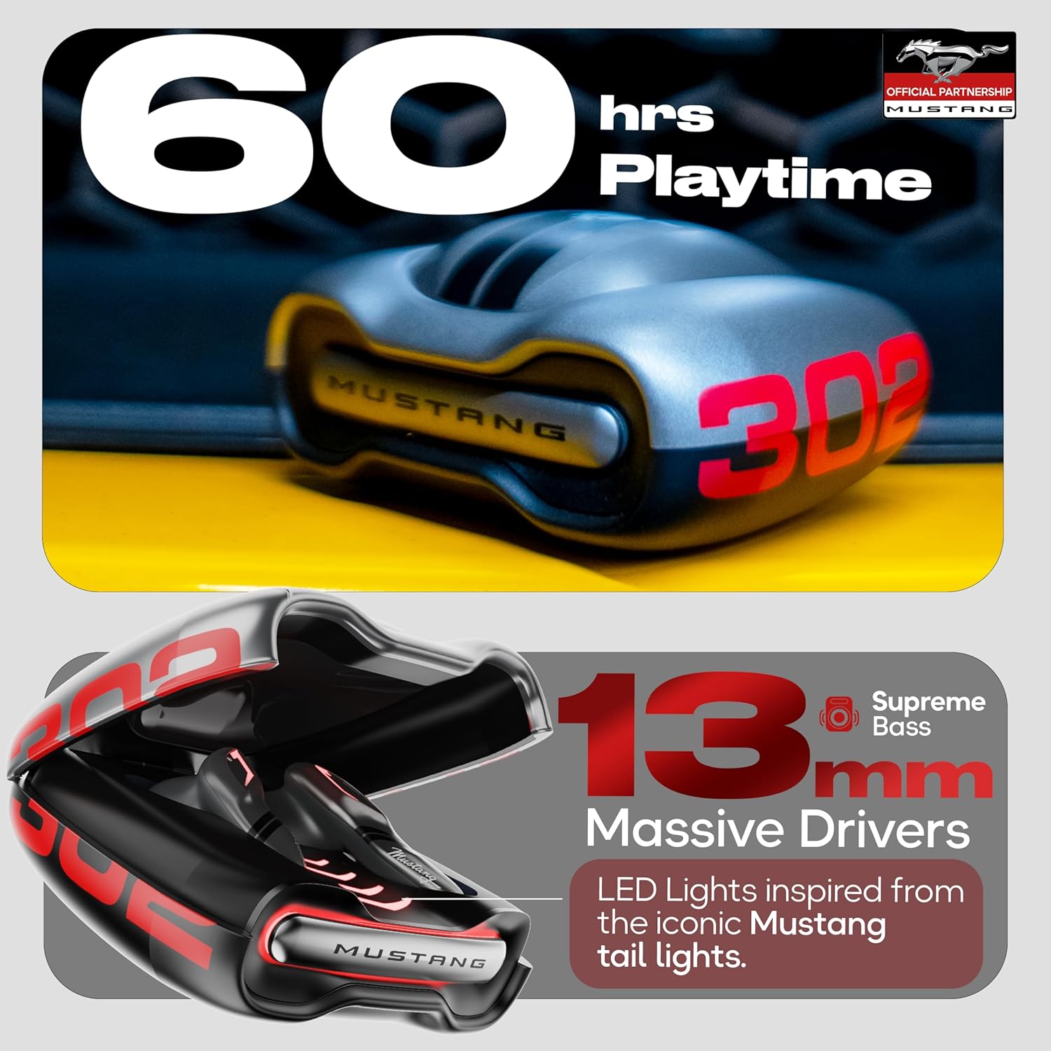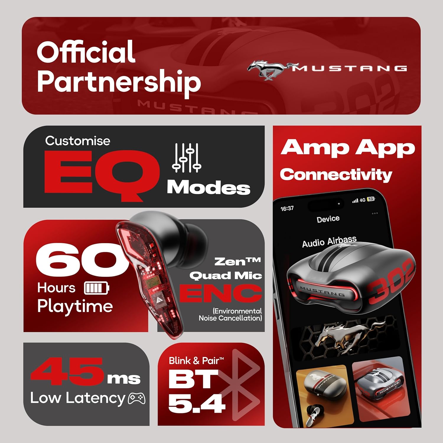 GOBOULT x Mustang Torq Wireless in Ear Earbuds with 60H Playtime, App Support, Quad Mic ENC, 45ms Low Latency, 13mm Driver, Breathing LEDs, Made in India Ear Buds Wireless (Silver)