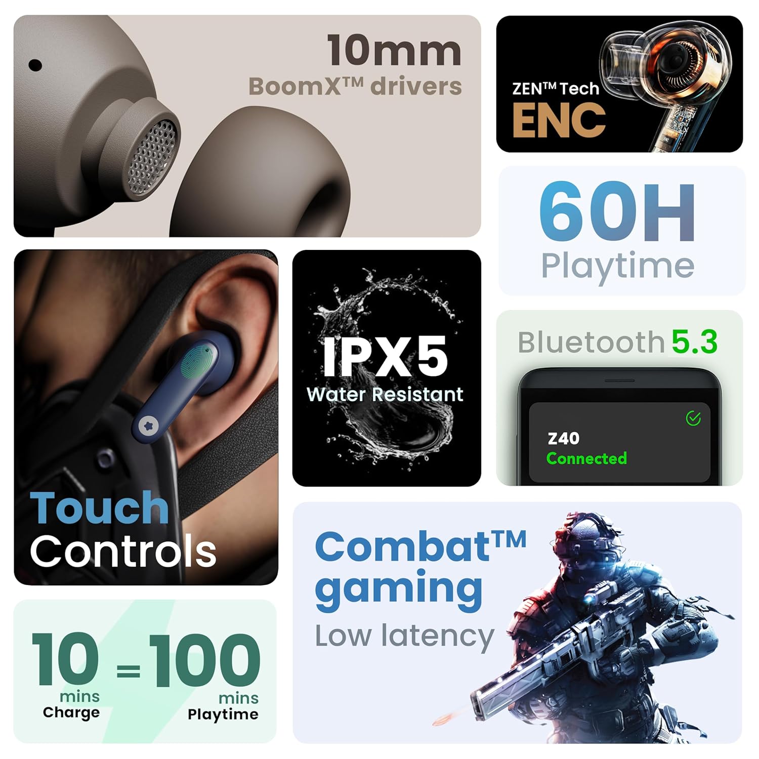 GOBOULT Z40 True Wireless in Ear Earbuds with 60H Playtime, Zen™ ENC Mic, Low Latency Gaming, Type-C Fast Charging, Made in India, 10mm Rich Bass Drivers, IPX5, Ear Buds TWS (Blue)