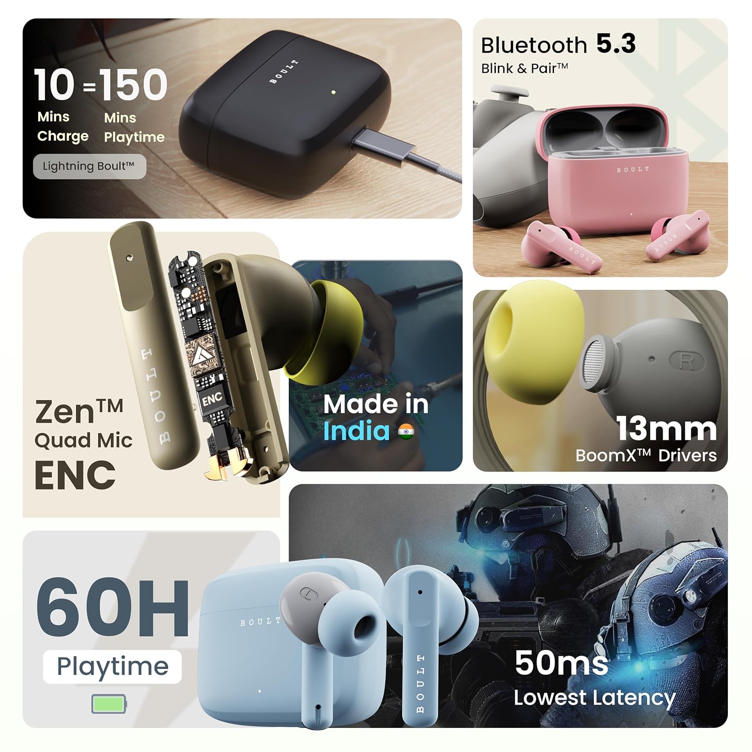 | Special Features | ‎13mm Rich Bass Drivers, 4 Clear Calling ENC Mics, 50ms Low Latency Gaming Mode, 60Hrs Playtime, Bluetooth 5.3, Fast Charging, Microphone Included, Sweatproof, Touch Control, Volume Control |