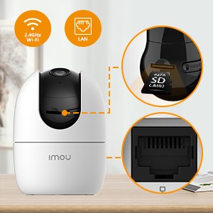 Imou Ranger 2 supports LAN and 2.4GHz Wi-Fi connectivity. For recording security, the micro SD card slot is located under the camera lens, when you move the camera lens up you will find the micro SD card slot and reset button.