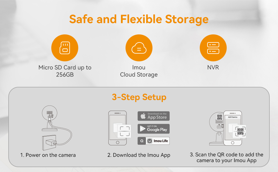 Plug in the wireless camera, download the Imou Life APP, and scan the on-device QR code to add. (supports 2.4GHz WiFi only)