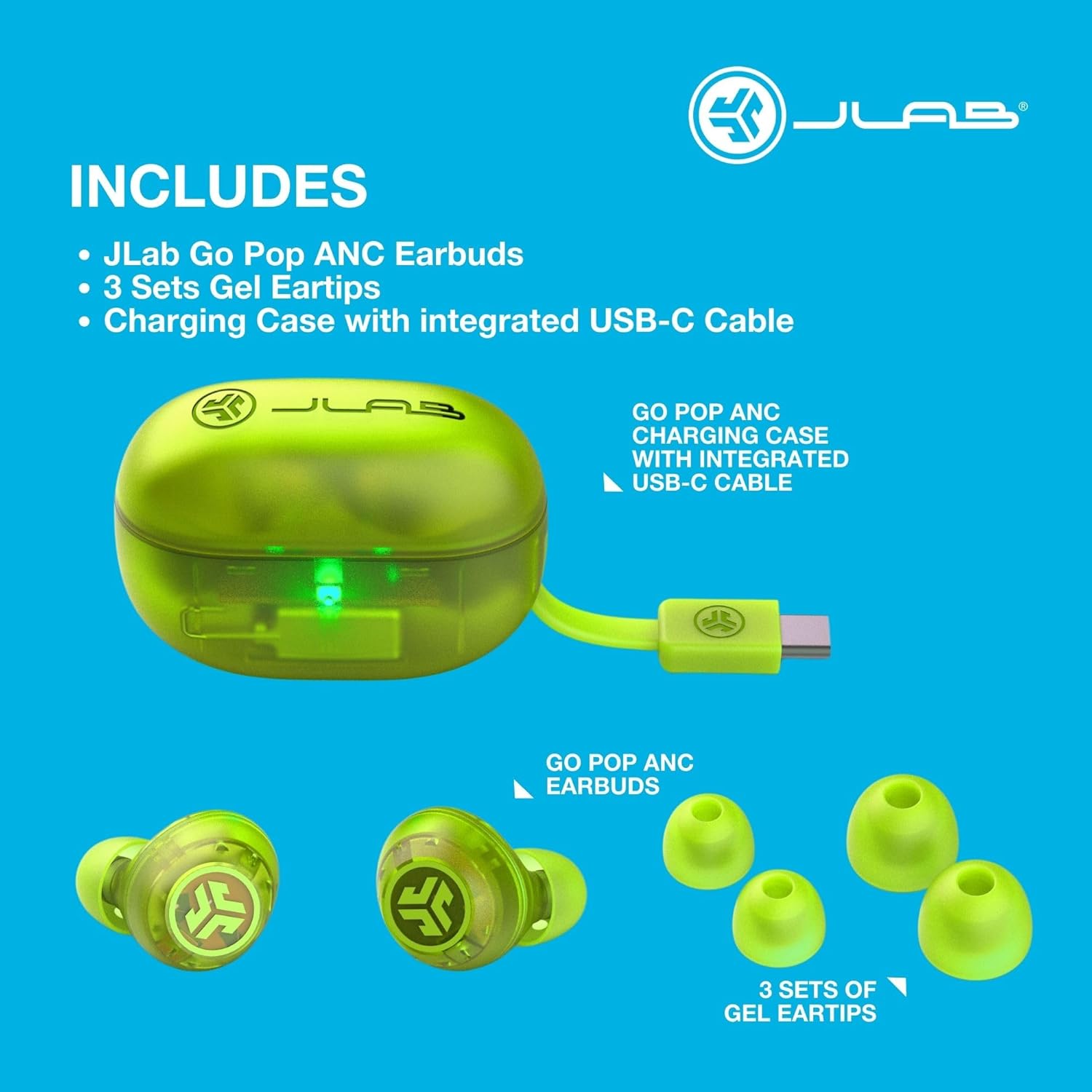 JLab Go Pop ANC Active Noise Cancelling Earbuds, Bluetooth Earphones, 24+ Hr Playtime Wireless Headphones, IP55 Sweat-Resistant in Ear Buds with Microphone, Multipoint, Transparent Neon Green