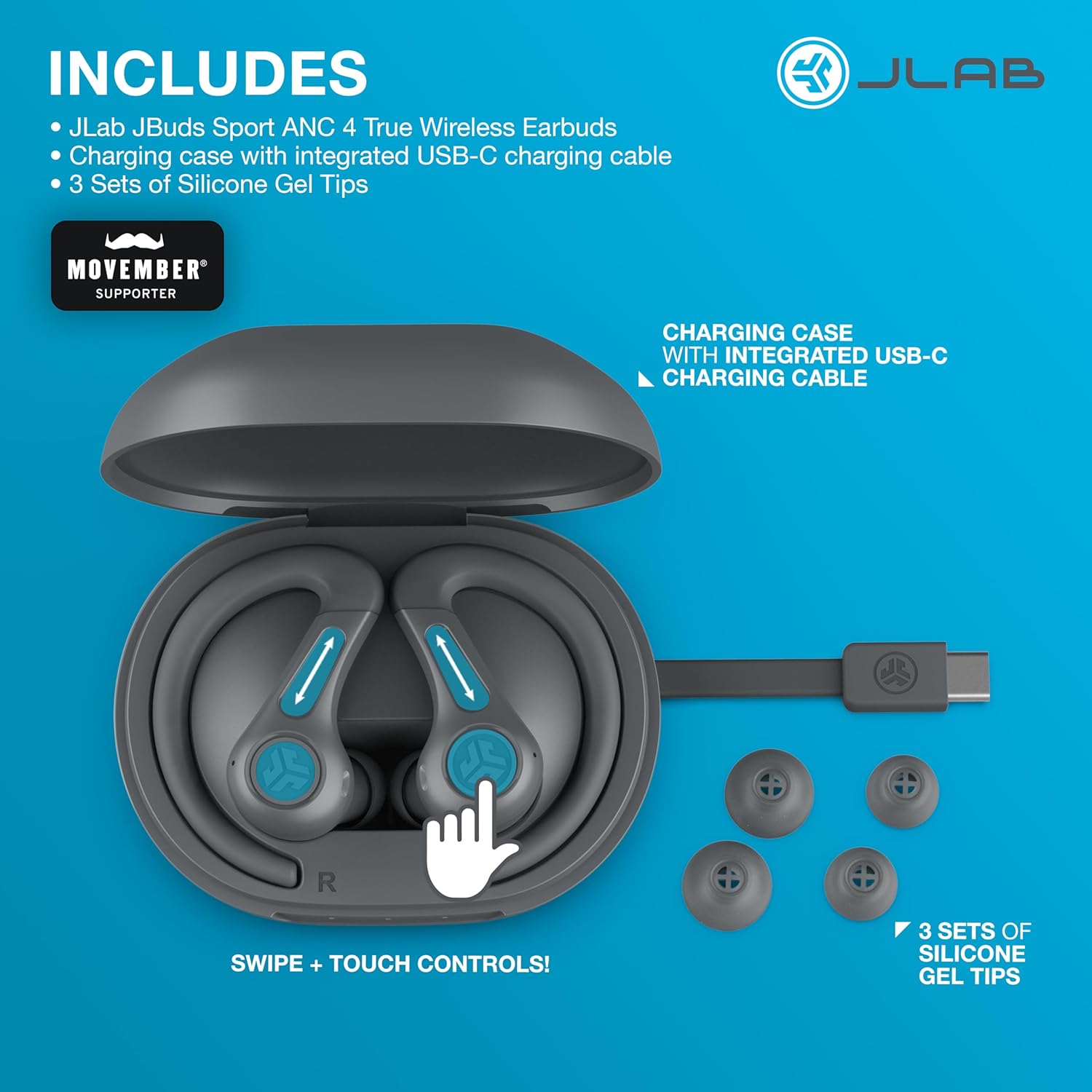 | Box Contents | 3 Sets of Silicone Gel Tips, Charging Case with USB-C Charging Cable, JLab Sport ANC 4 True Wireless Earbuds |