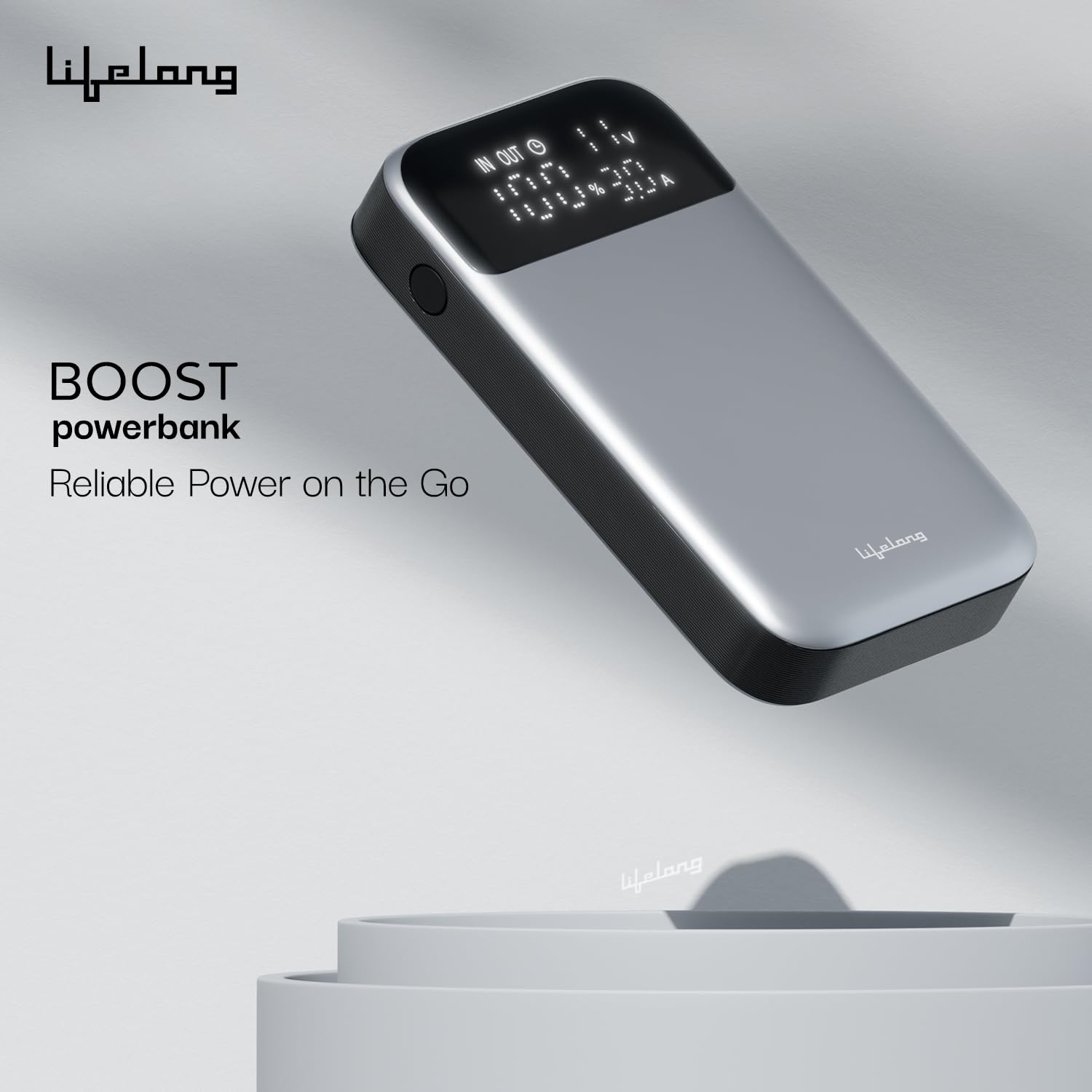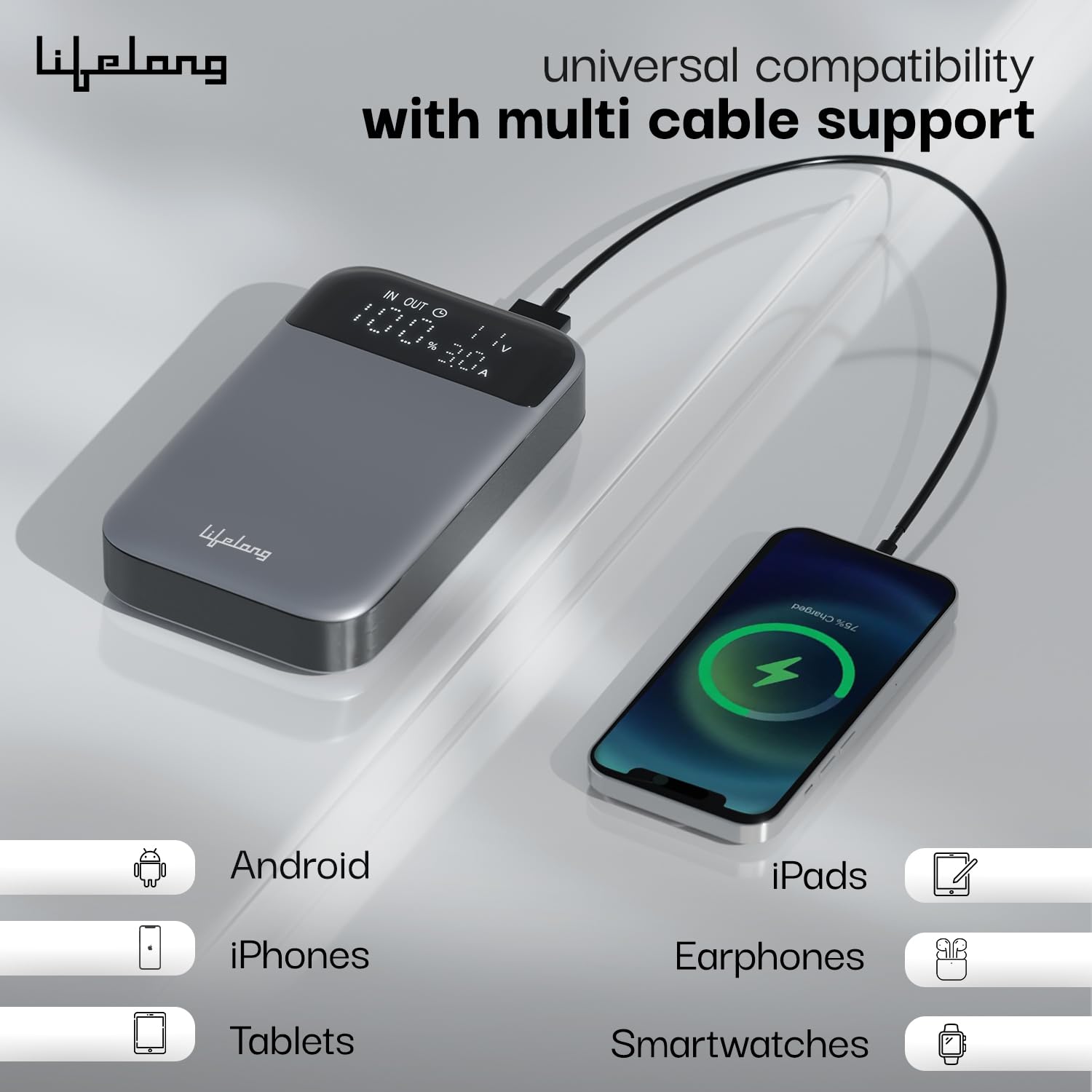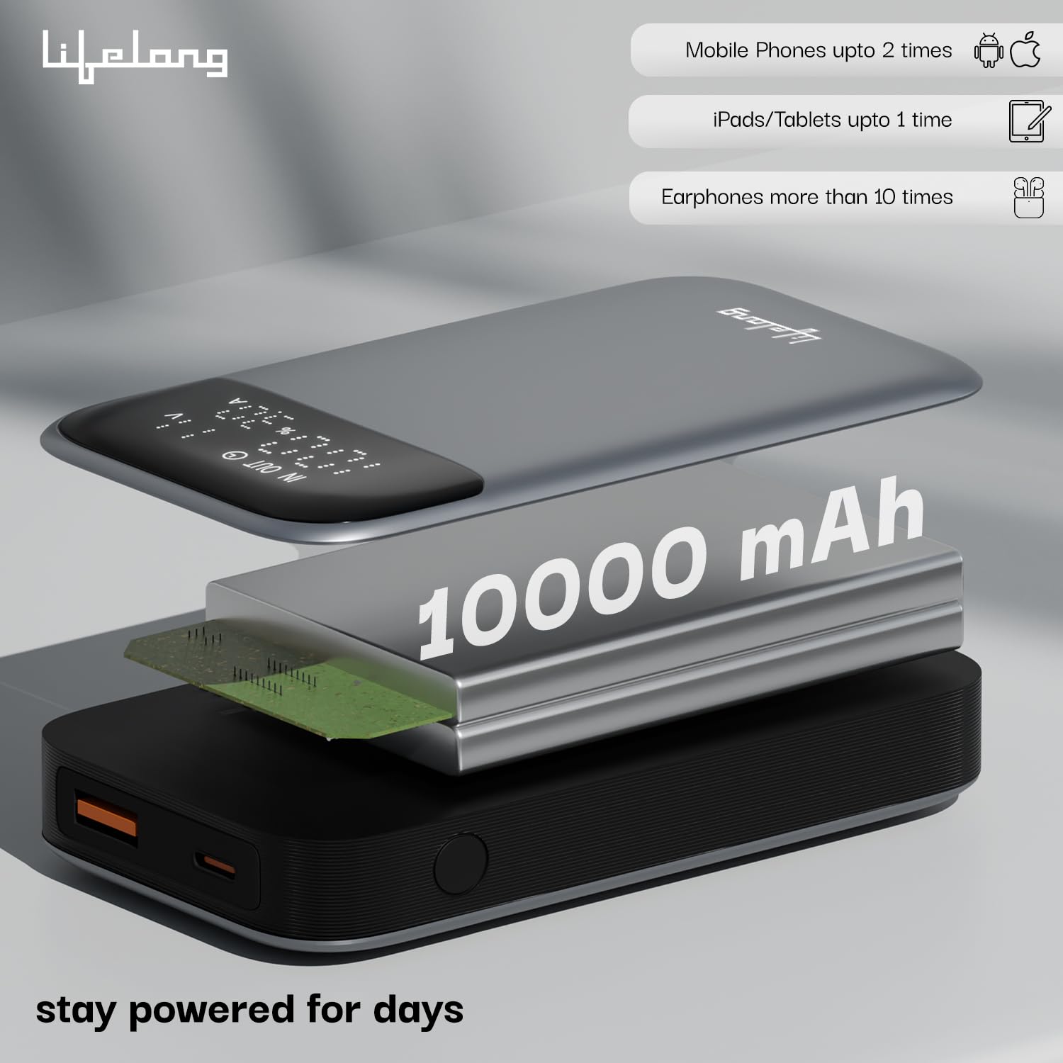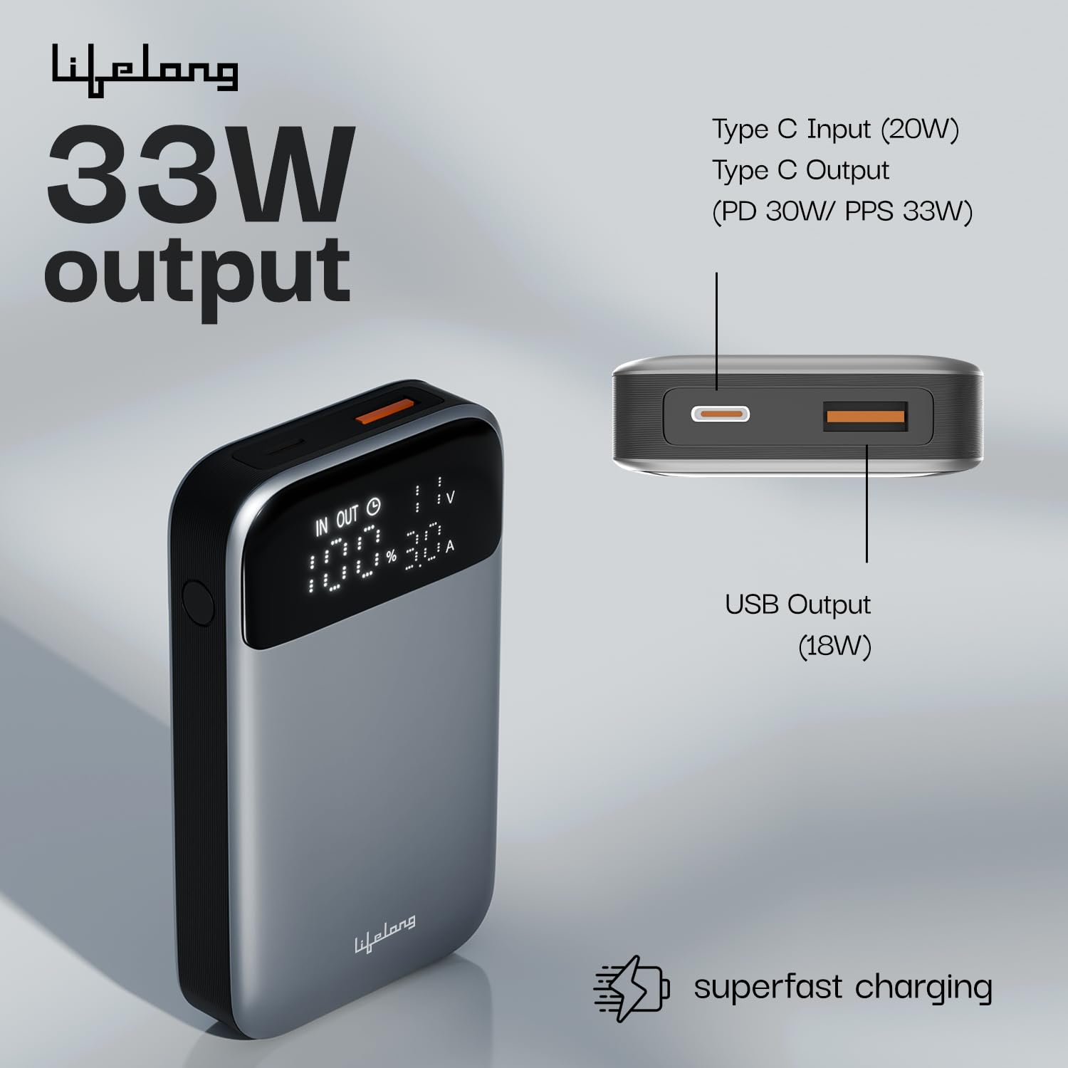 Lifelong Electronics 10000mAh Slim Compact Power Bank | Type C Input | 2 Output Ports (Type C & Type A) | 33W Fast Charging Powerbank | Cable Included |Ideal for Mobiles, Earbuds, Speakers (Grey)