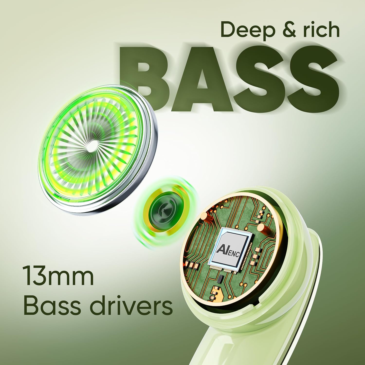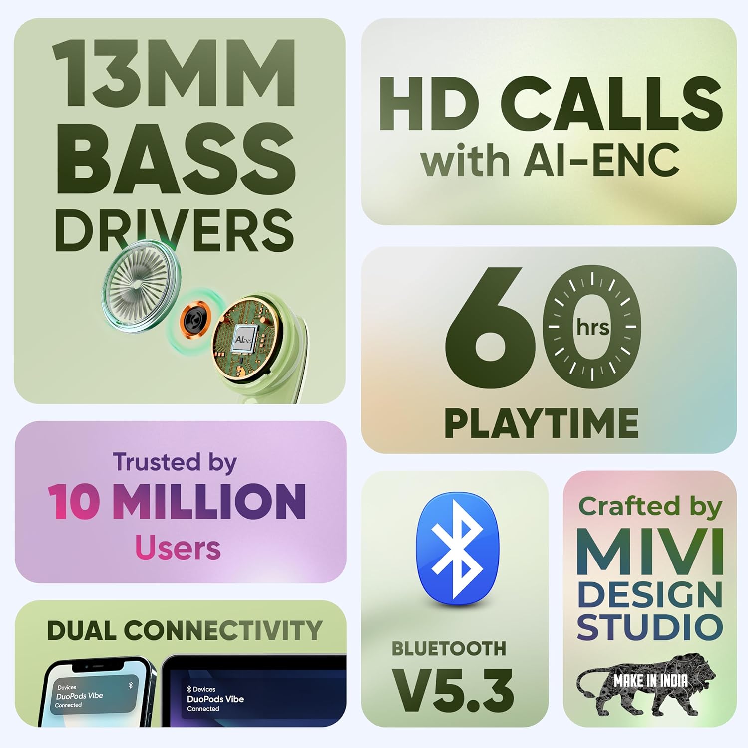 Mivi DuoPods Vibe Earbuds, 60 Hours Playtime, AI-ENC for HD Calls, 13mm Drivers, IPX 4.0, BT v5.3, Made in India True Wireless Bluetooth Ear Buds (Mystic Green)
