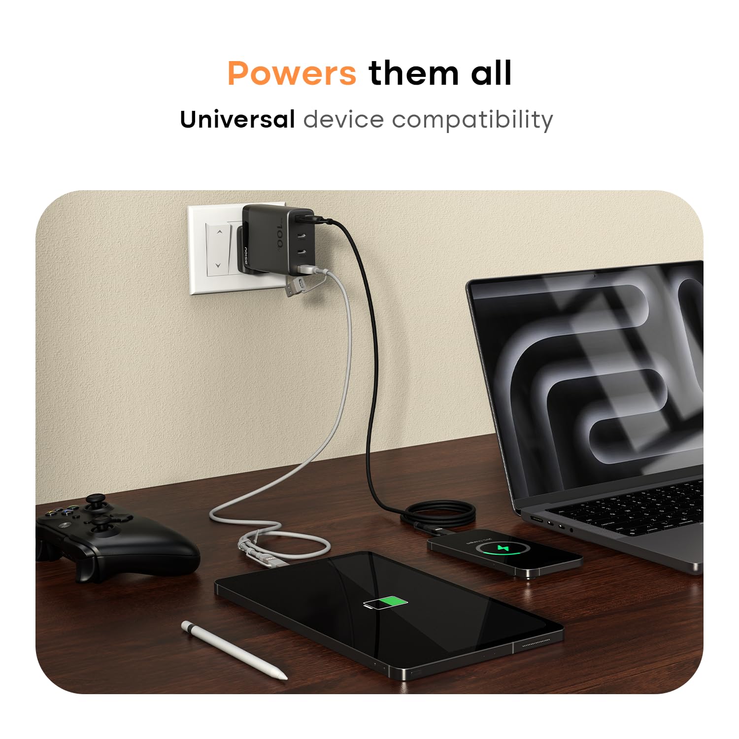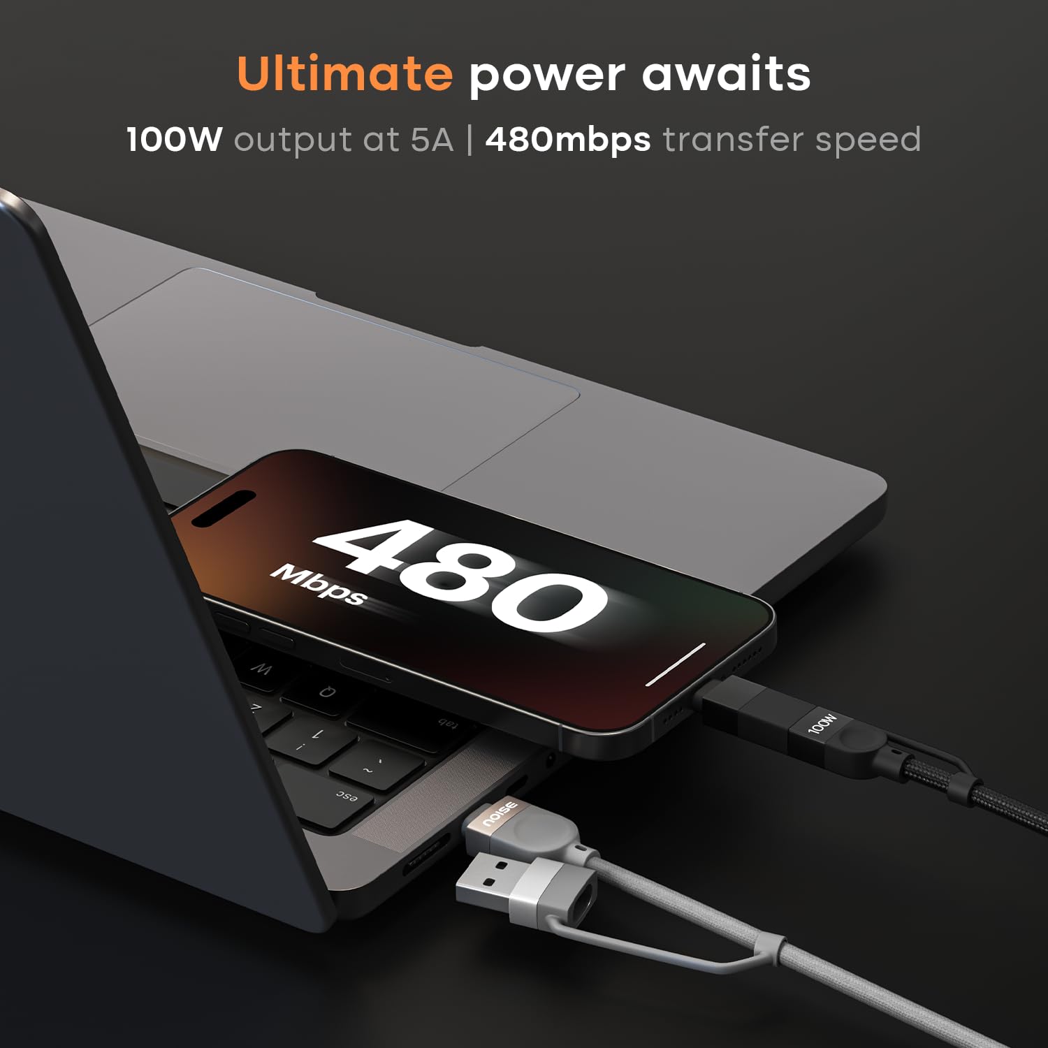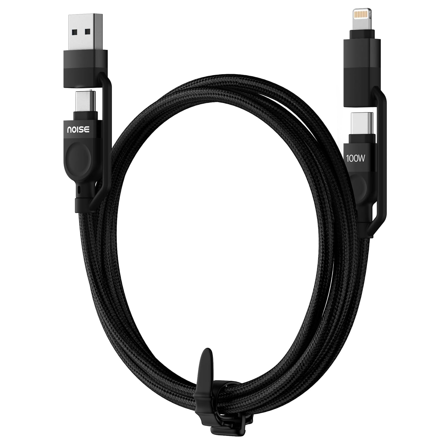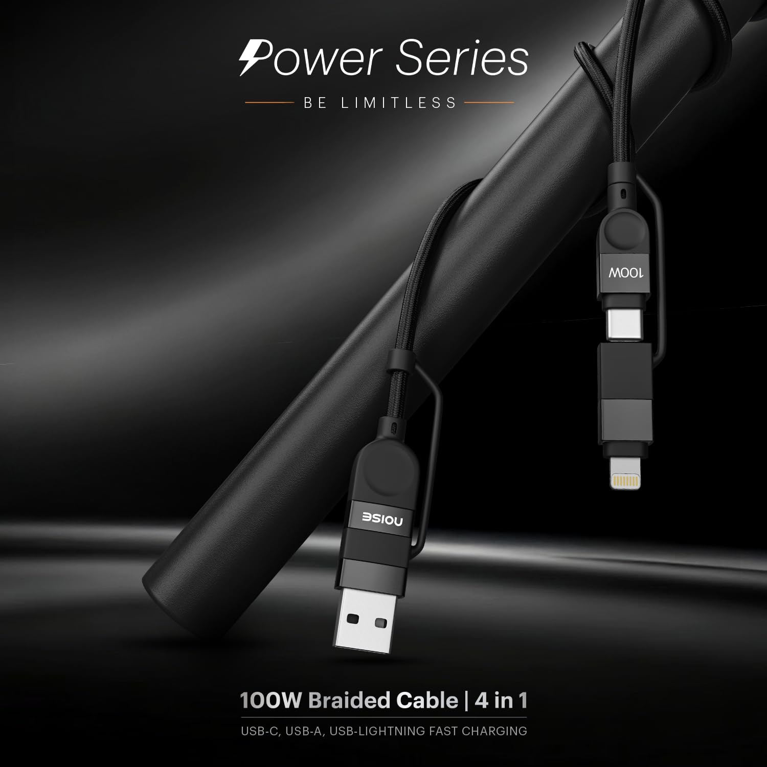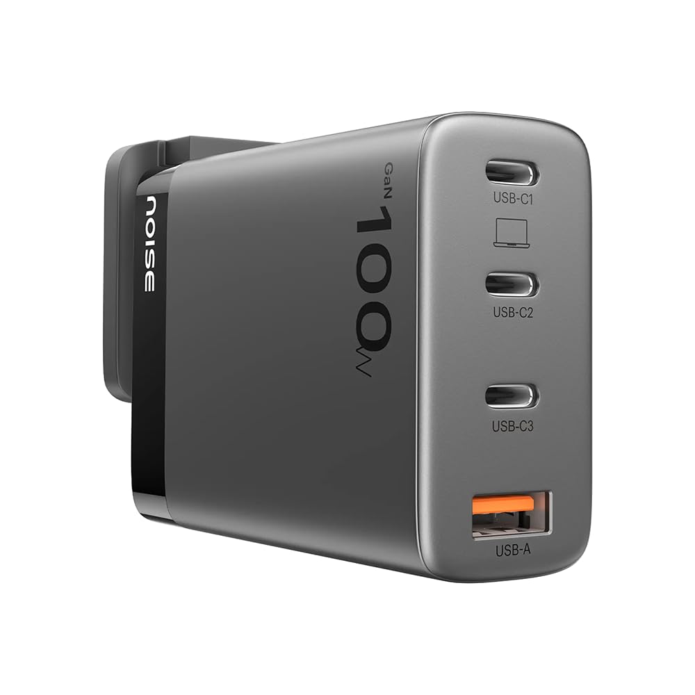 Noise Power Series 100W GaN Charger with Super Fast Charging 4-in-1 Braided Cable (1 meter) : Super Fast Charging Adapter, 4 Ports (3 USB-C Type, 1 USB-A), Supports All iPhones, Android Phones