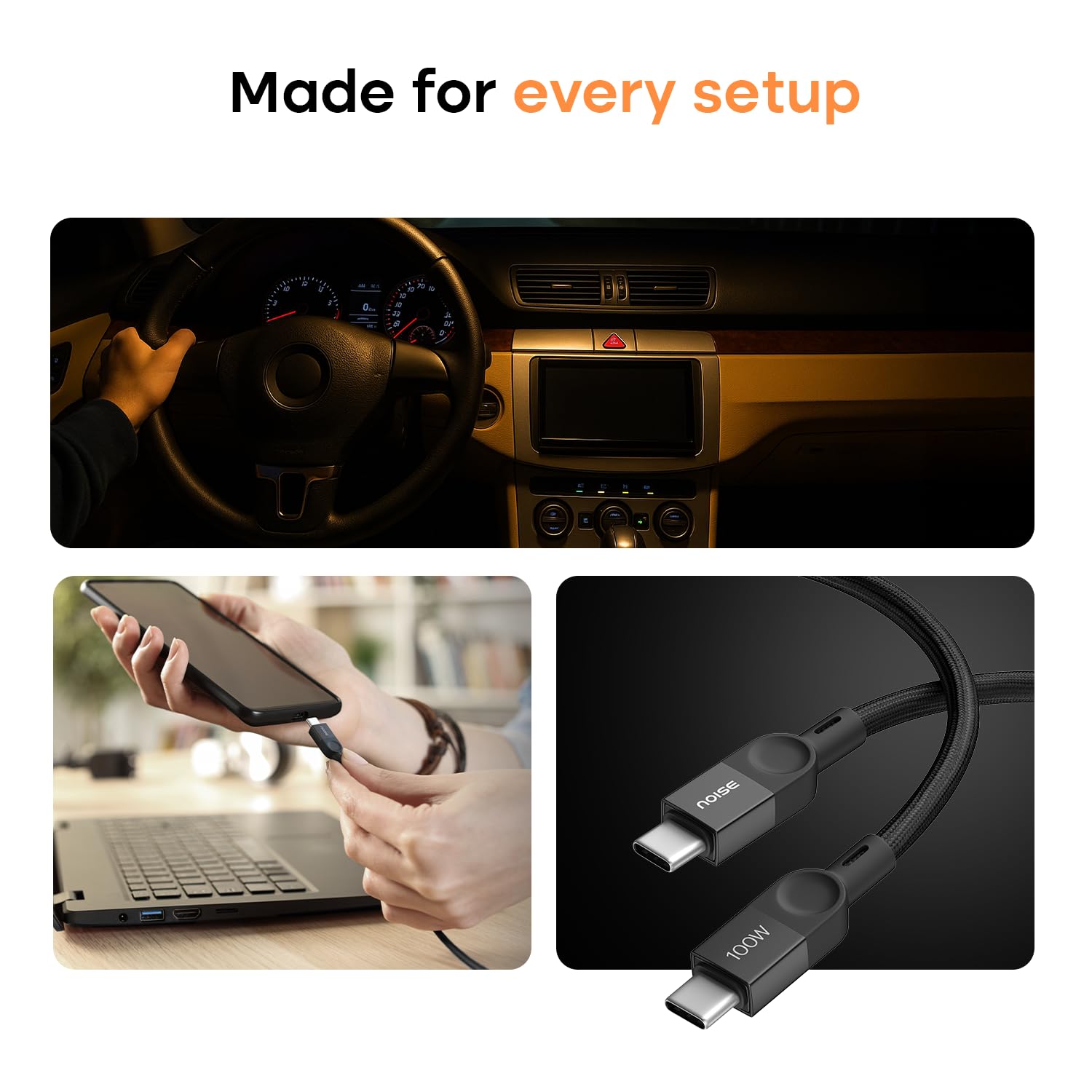Noise Power Series 100W GaN Charger with Super Fast Charging Type-C to Type-C Braided Cable (1 meter):Super Fast Charging Adapter, 4 Ports (3 USB-C Type, 1 USB-A), Supports All iPhones, Android Phones