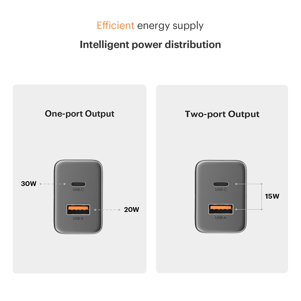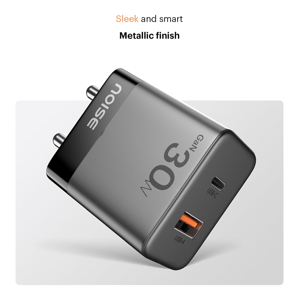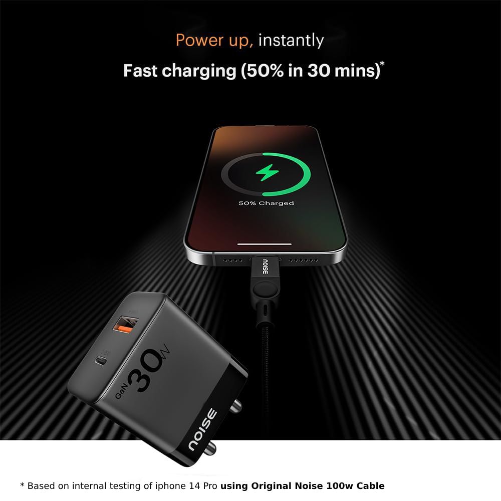Noise Power Series 30W Gan Charger: 2 Ports (1 USB-C Type, 1 USB-A), iPhone 0-50% In 30Mins, With Globally Compatible, Supports All iPhones, Android Phones, Tablets (Black)