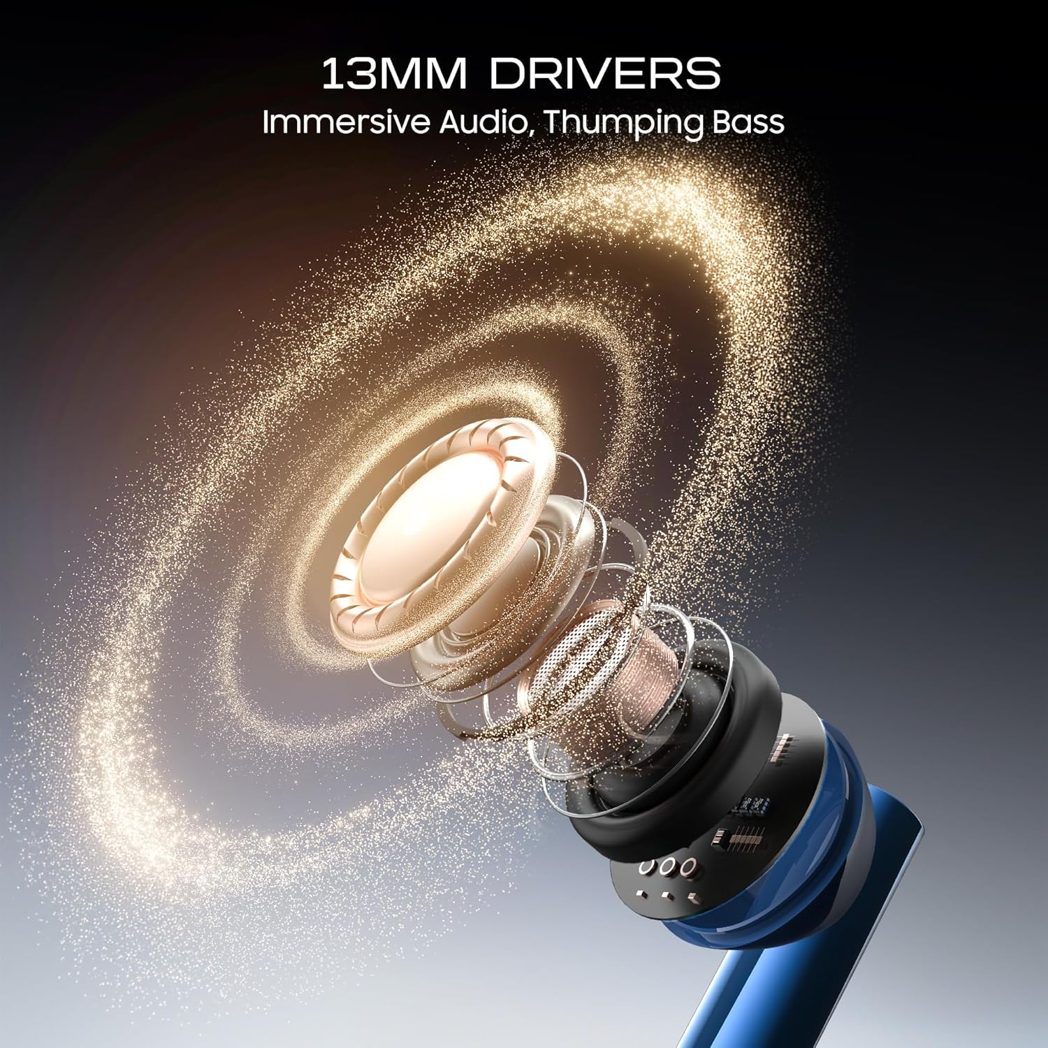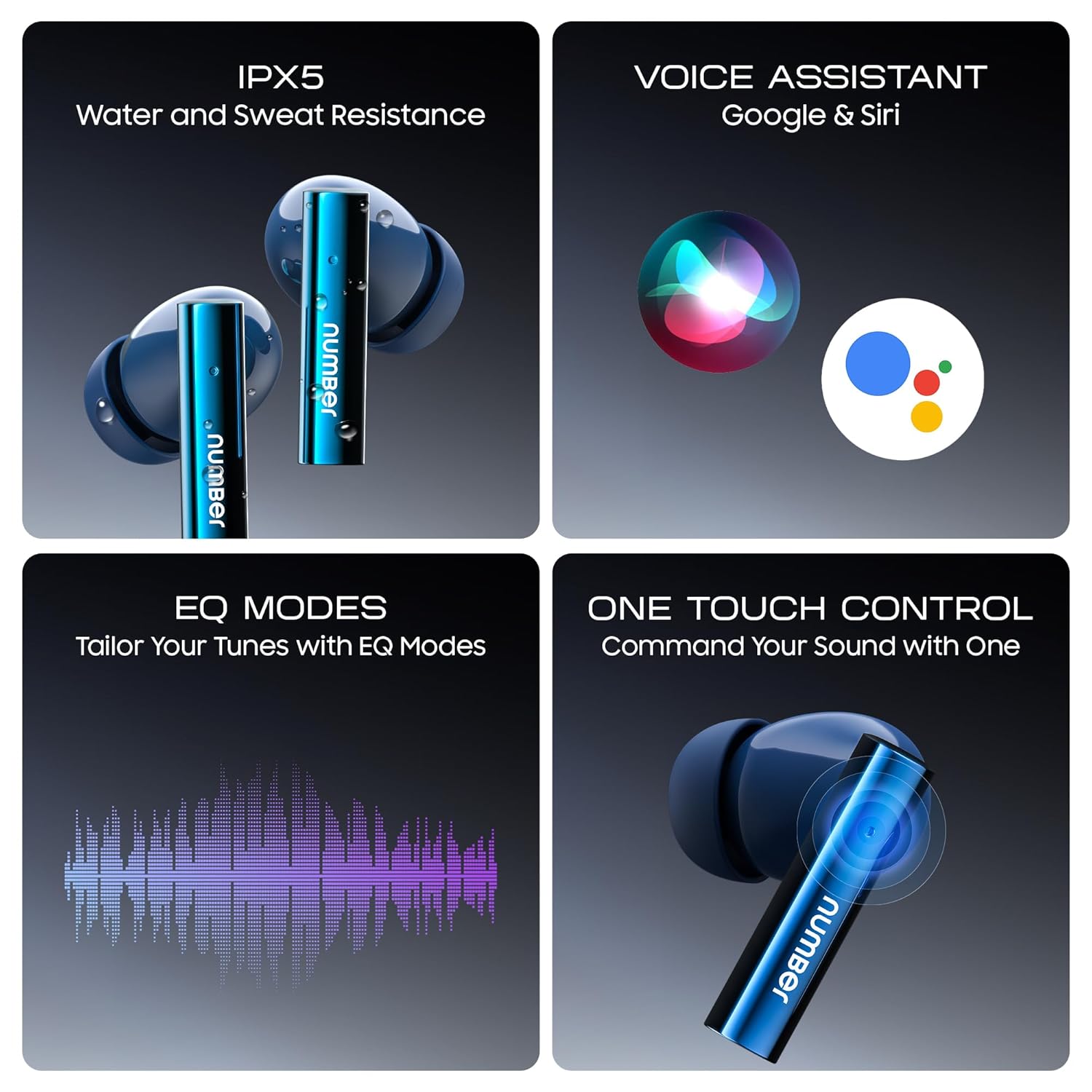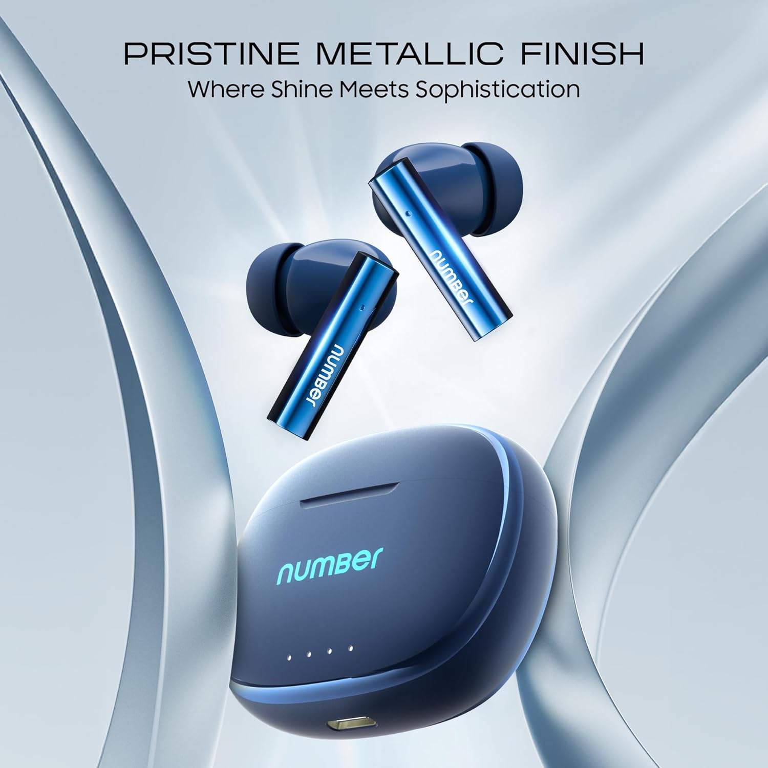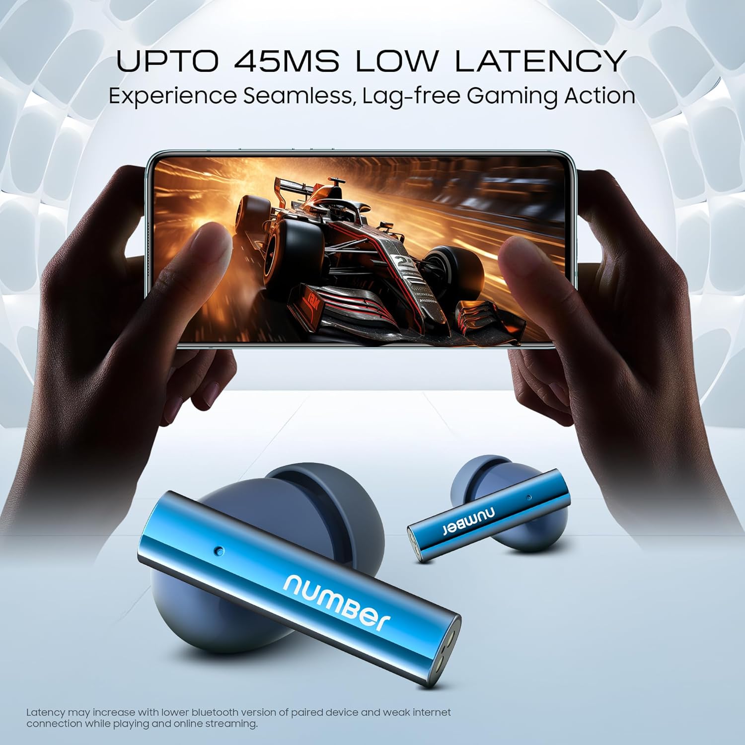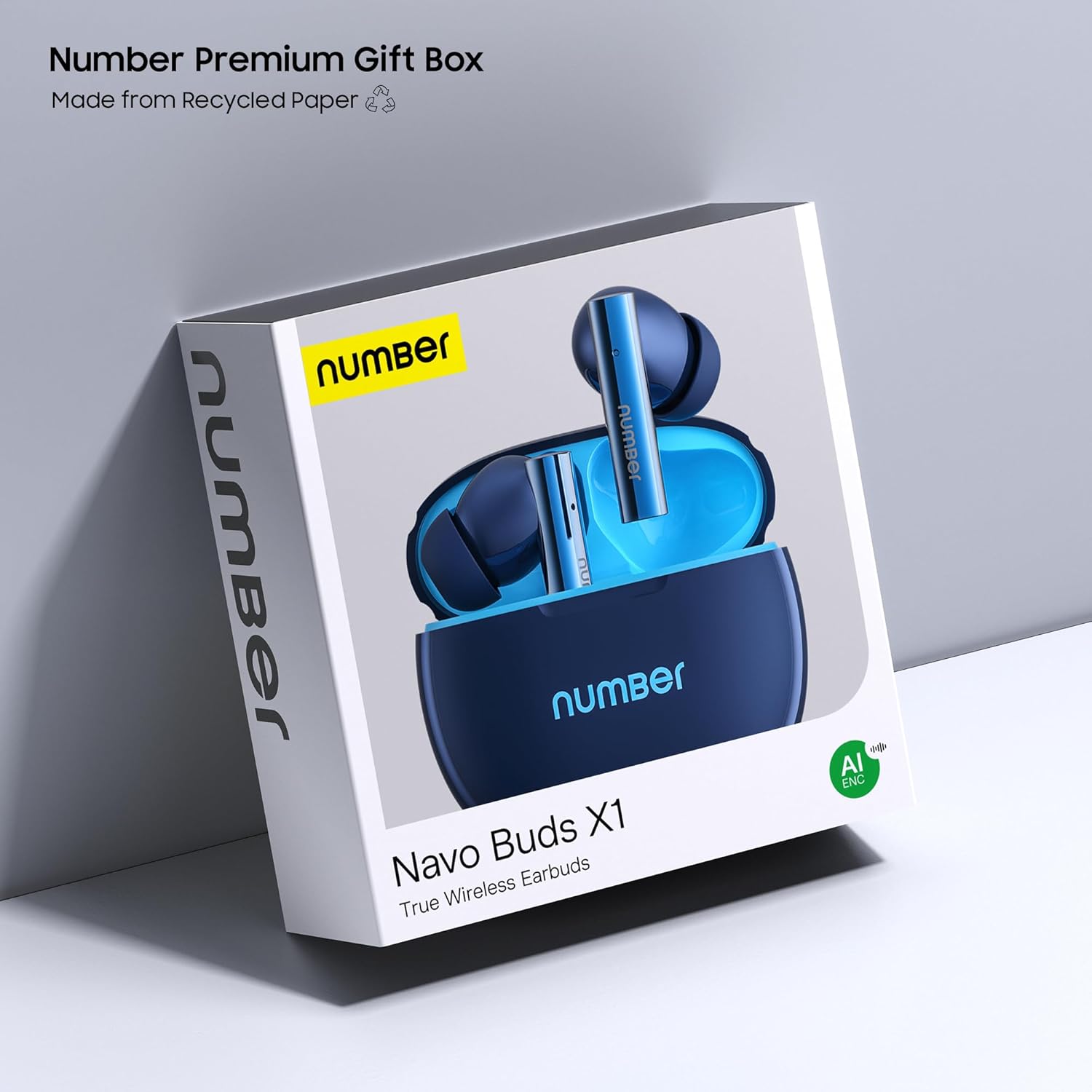 Number Navo Buds X1 w/ 50H Playtime, Dual Pairing, 13mm Speakers, ENC, 45ms Low Latency True Wireless Bluetooth (Blue Pool)