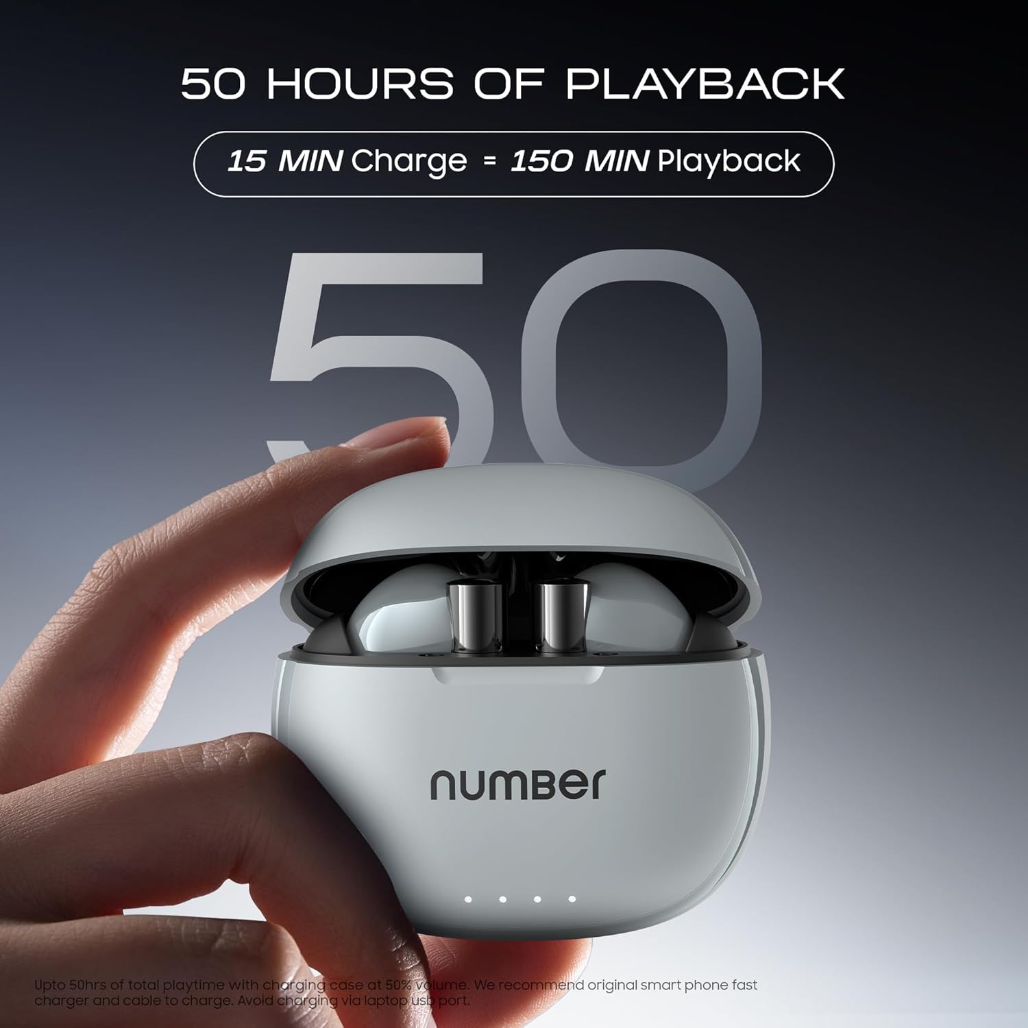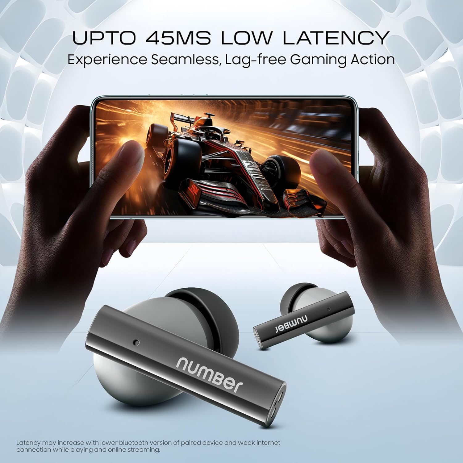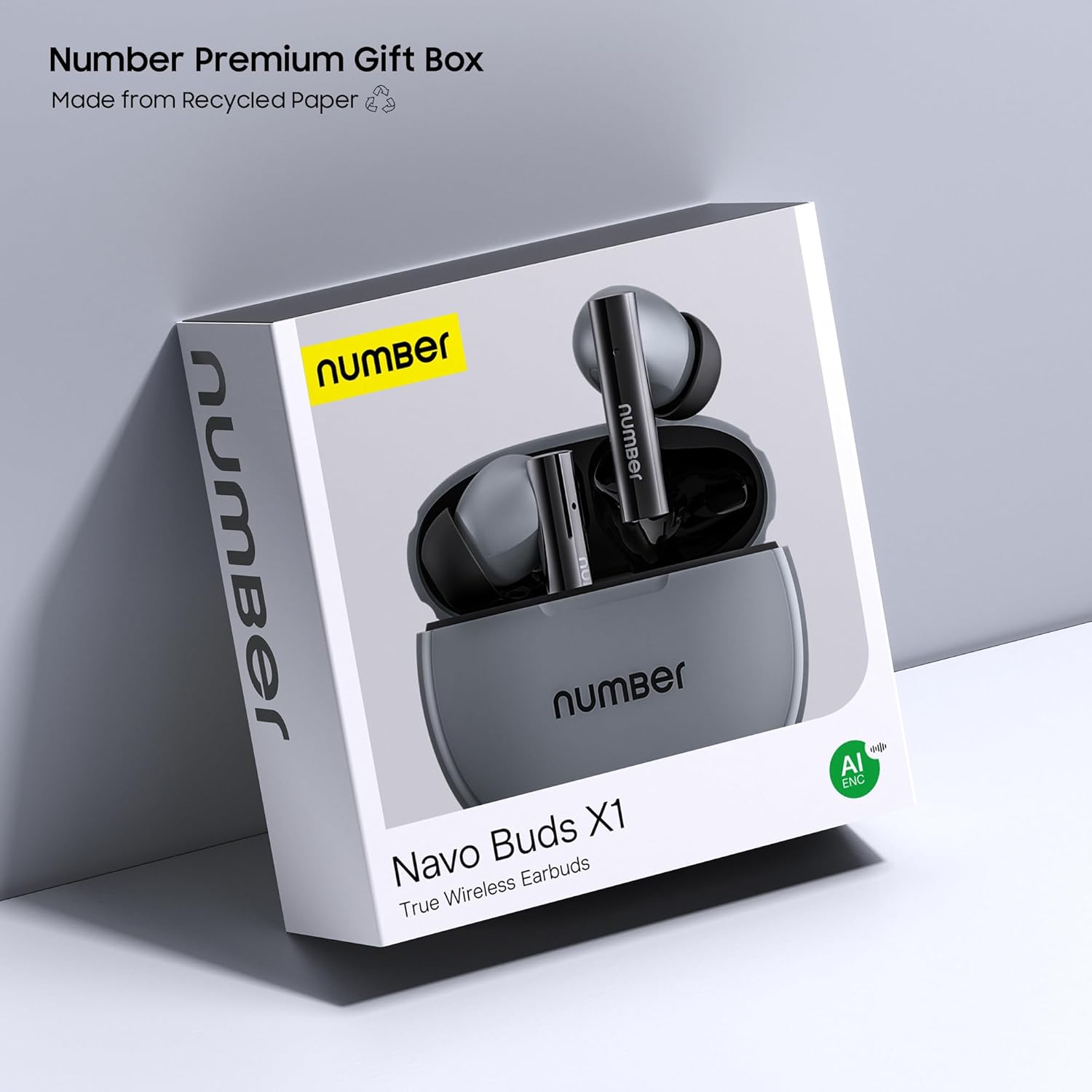 Number Navo Buds X1 w/ 50H Playtime, Dual Pairing, 13mm Speakers, ENC, 45ms Low Latency True Wireless Bluetooth (Grey Stone)