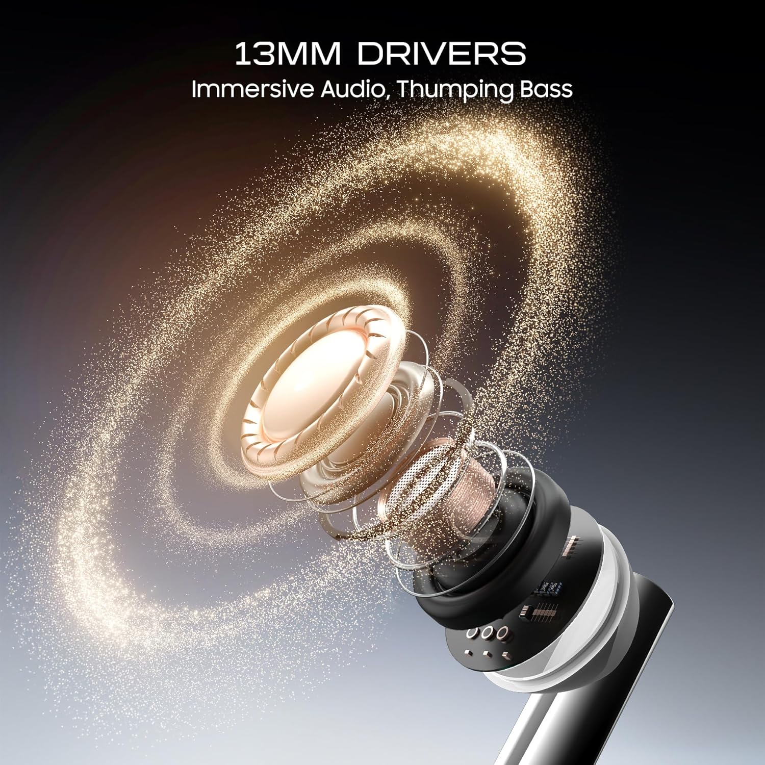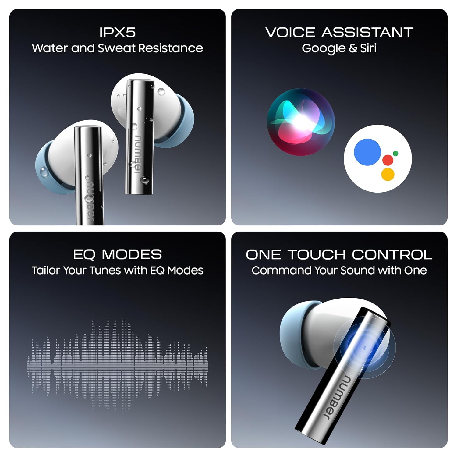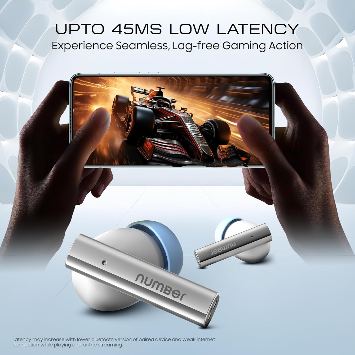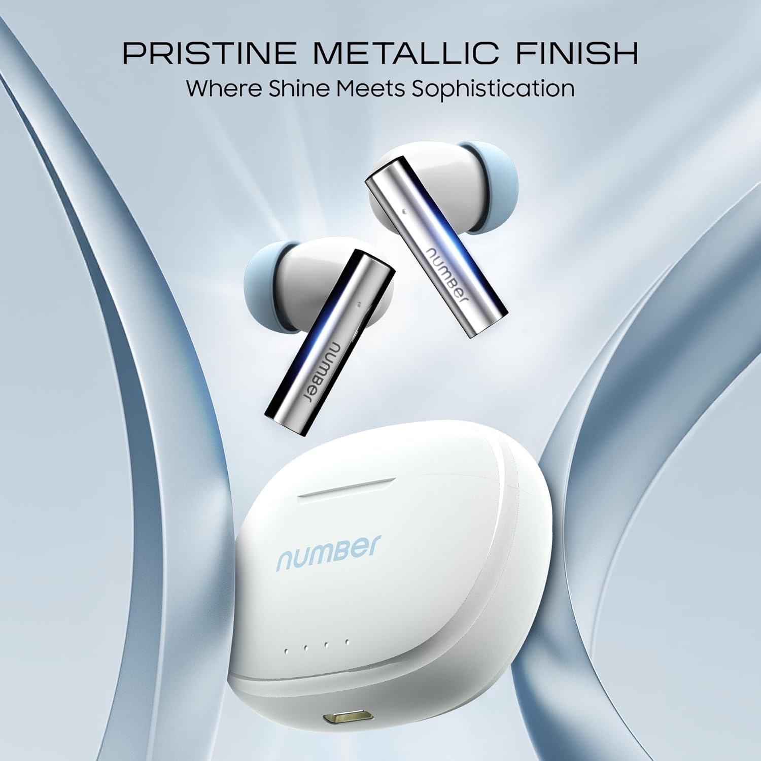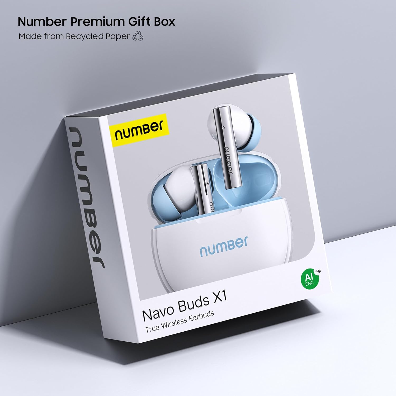 Number Navo Buds X1 w/ 50H Playtime, Dual Pairing, 13mm Speakers, ENC, 45ms Low Latency True Wireless Bluetooth (White Sky)