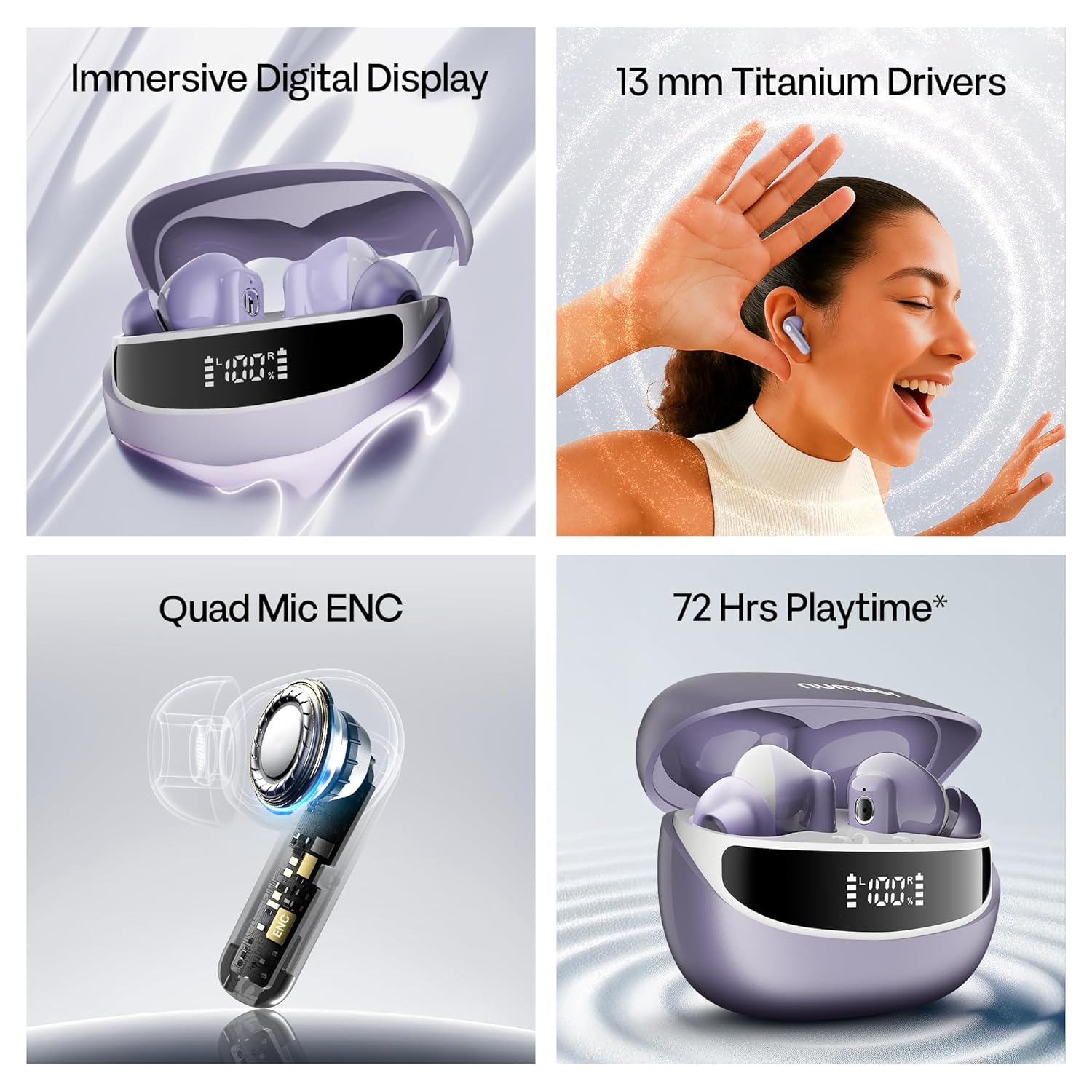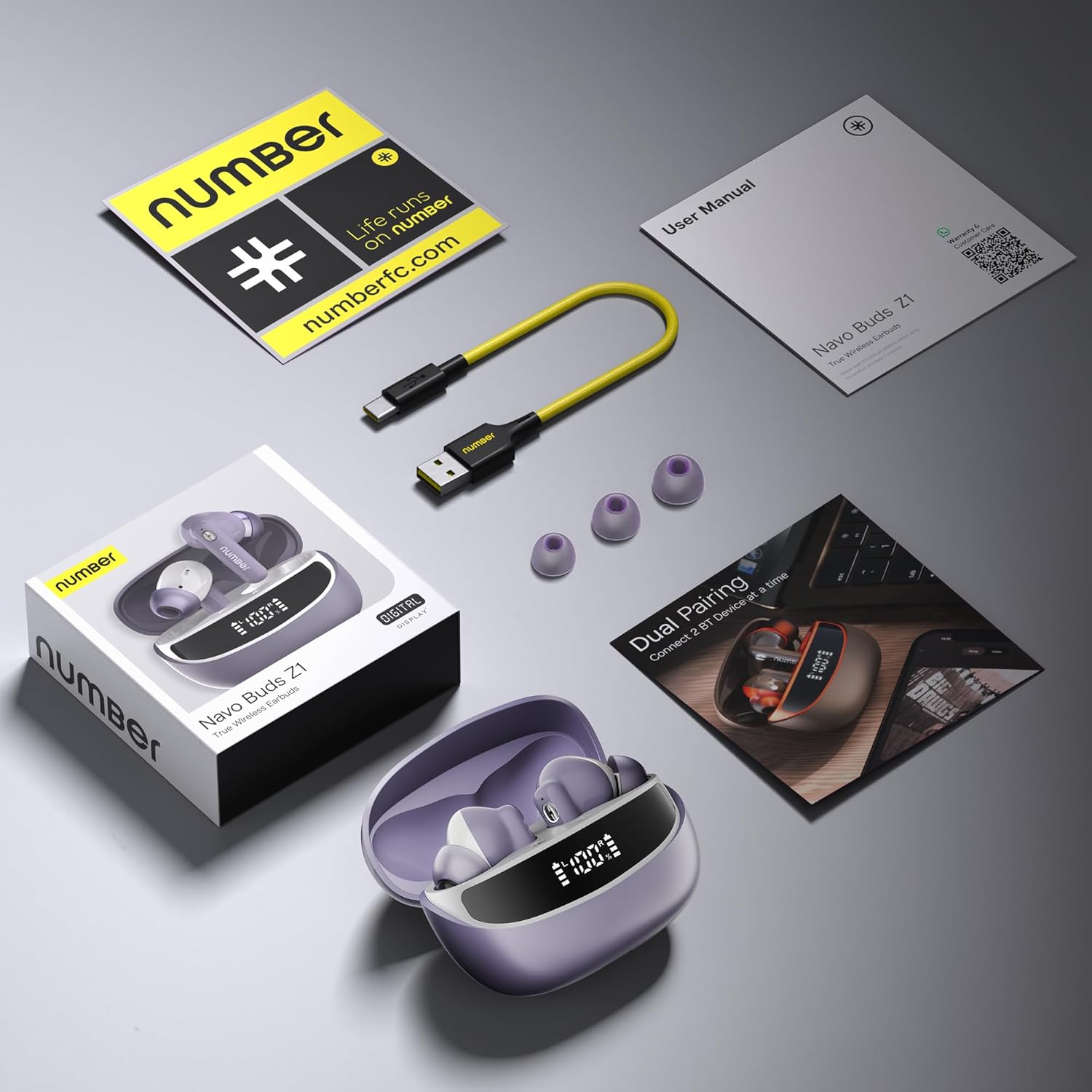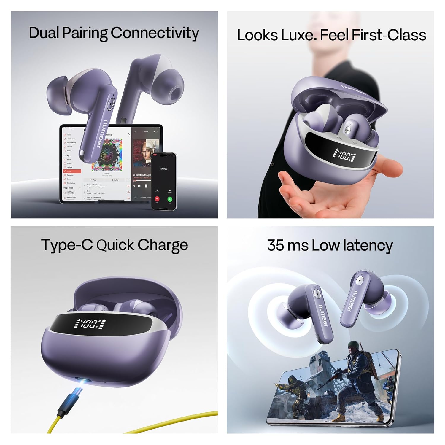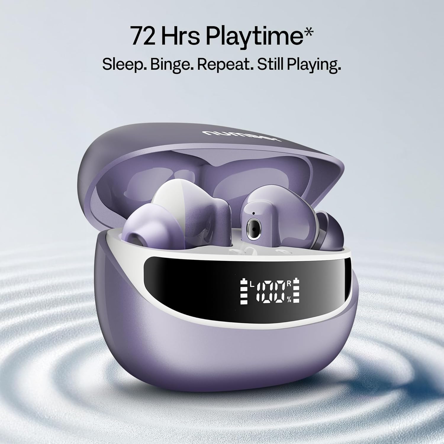 Number Navo Buds Z1 TWS Earbuds | 72H Playtime | Digital Display Case | Quad-Mic ENC | Dual Pairing | Hi-Bass 13mm Drivers | Quick Charge | 35ms Low Latency | IPX5 | Touch Controls | (Dusk Violet)