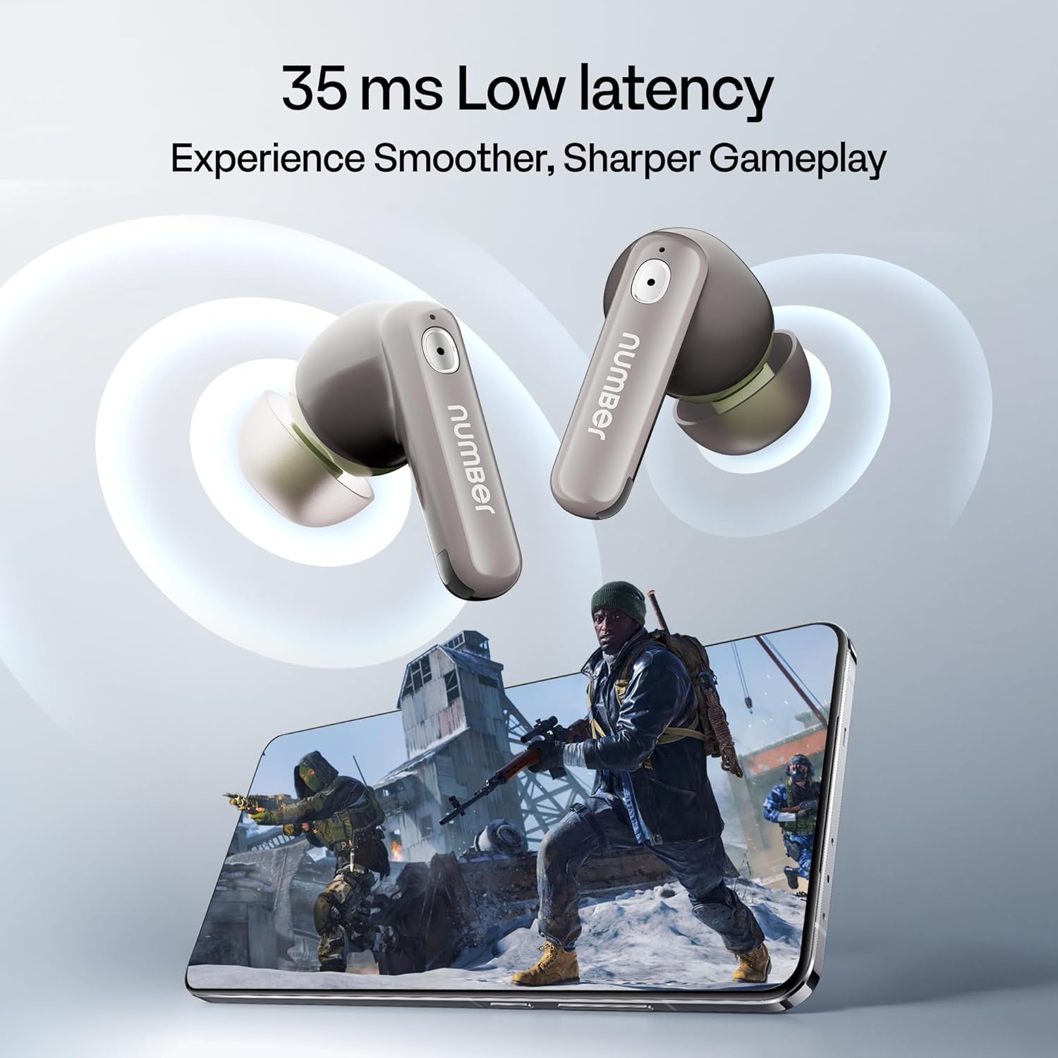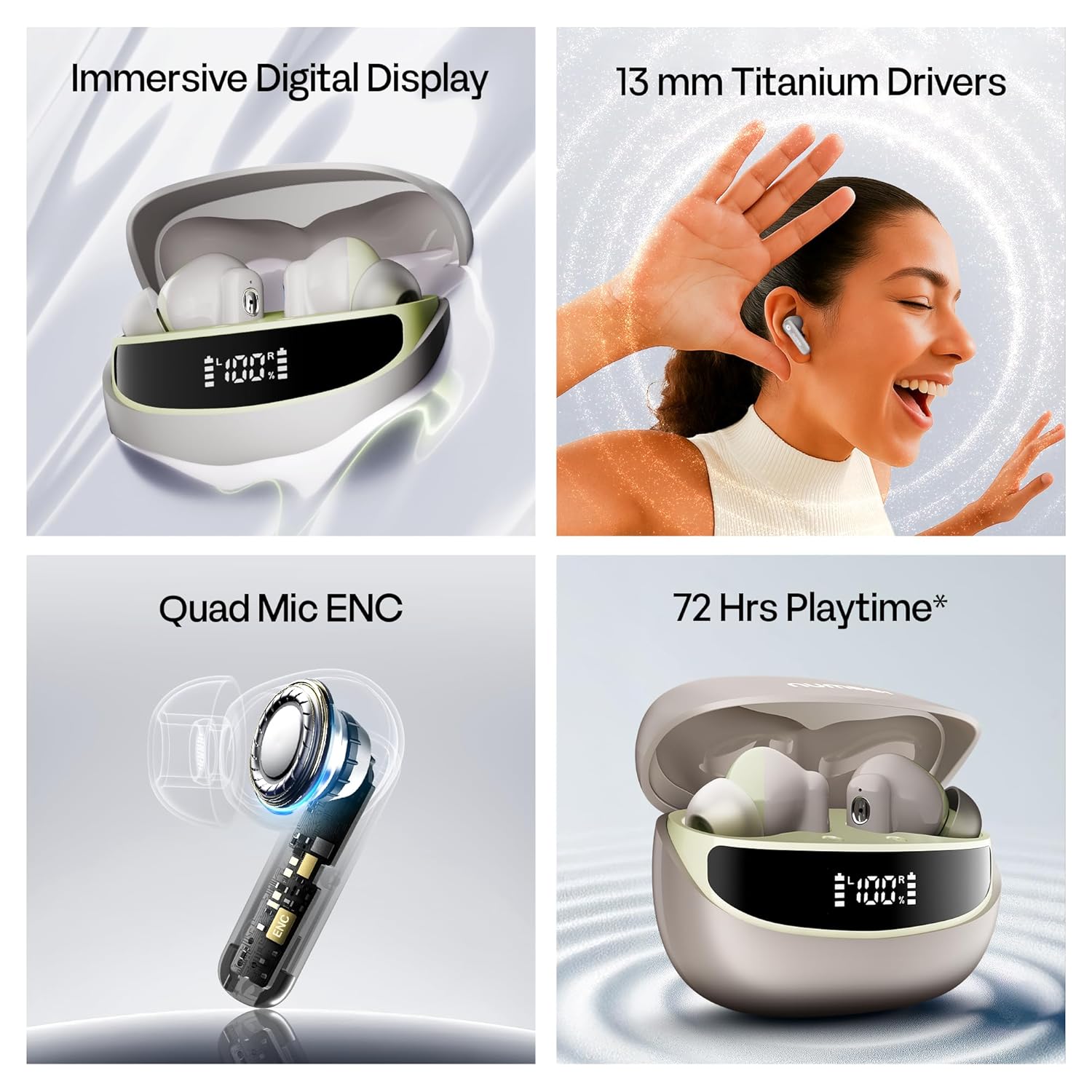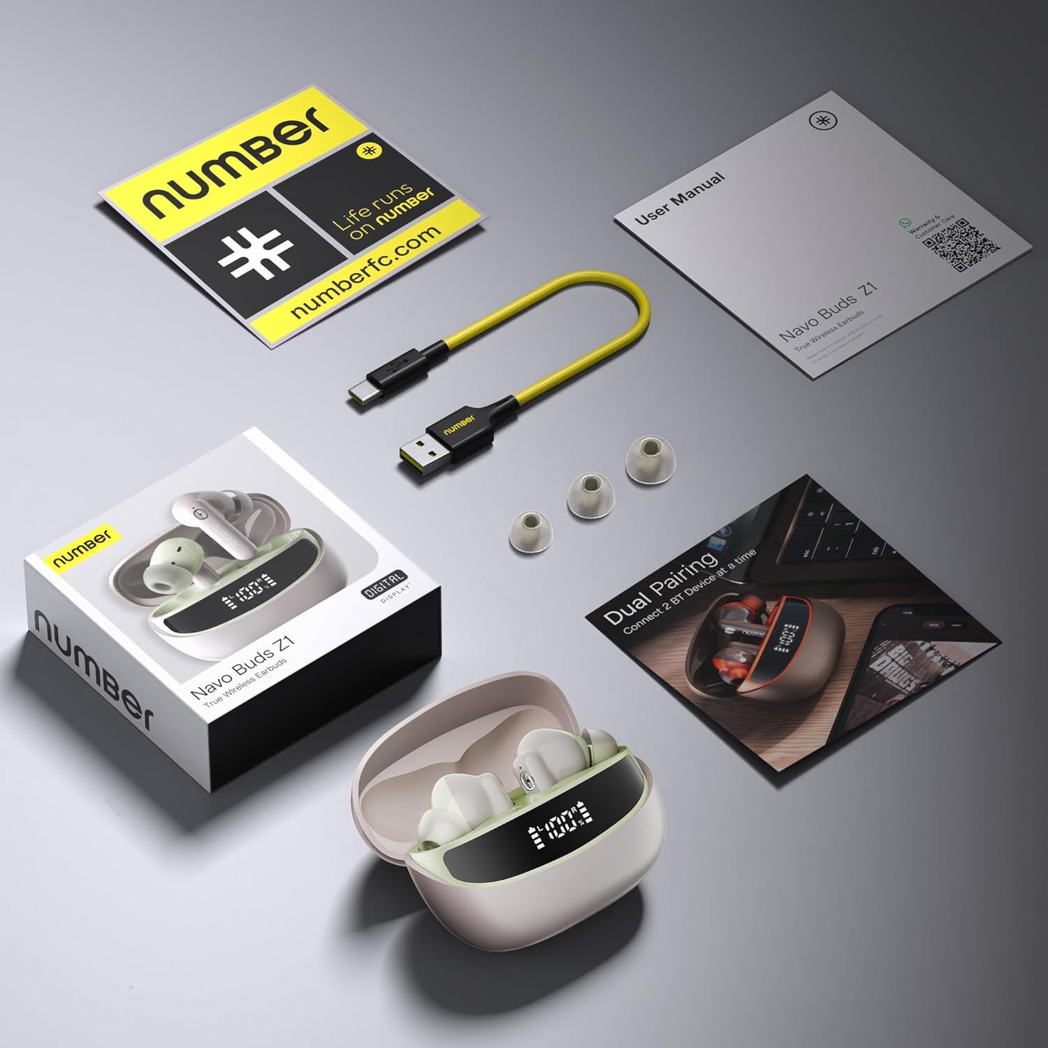 Number Navo Buds Z1 TWS Earbuds | 72H Playtime | Digital Display Case | Quad-Mic ENC | Dual Pairing | Hi-Bass 13mm Drivers | Quick Charge | 35ms Low Latency | IPX5 | Touch Controls | (Spring Beige)