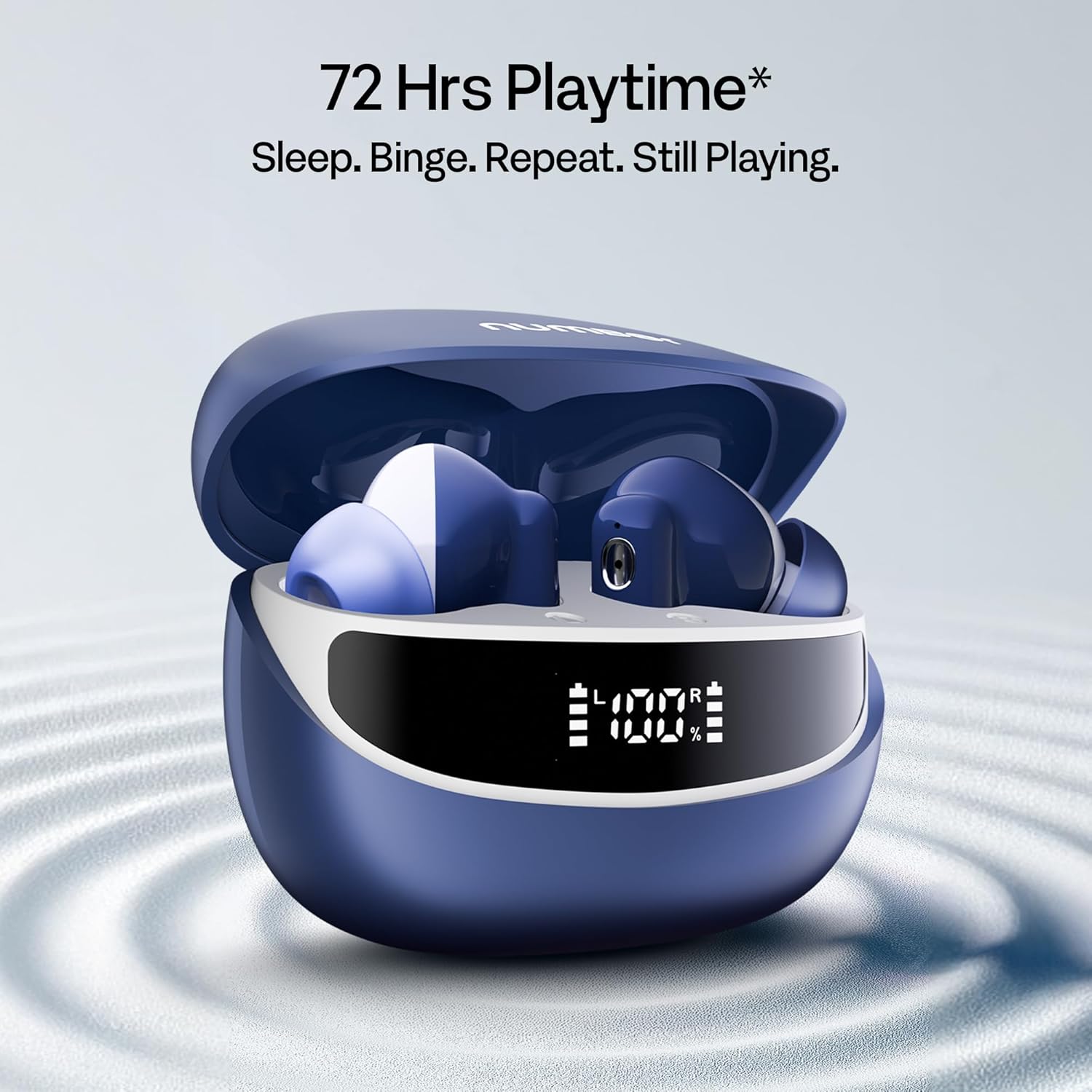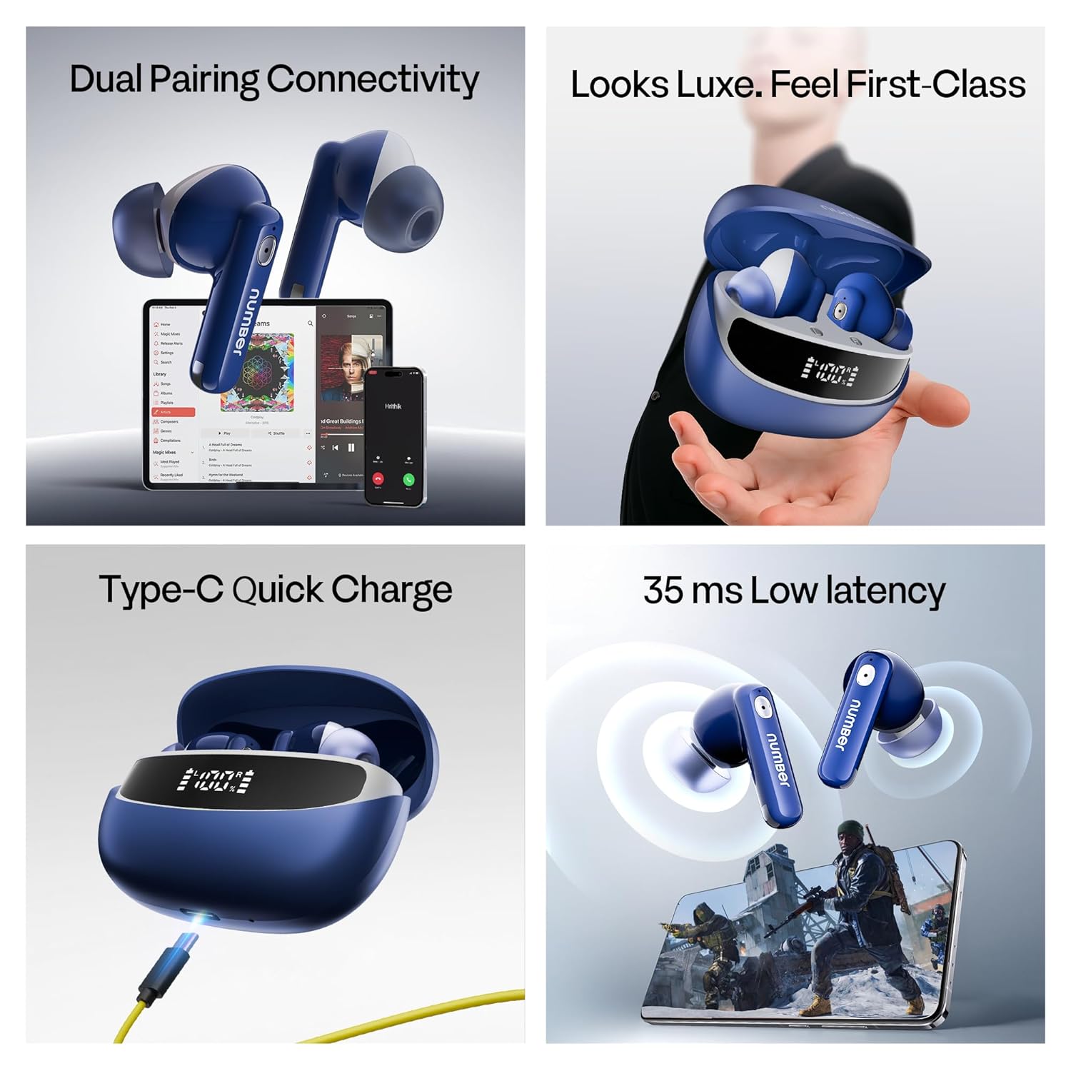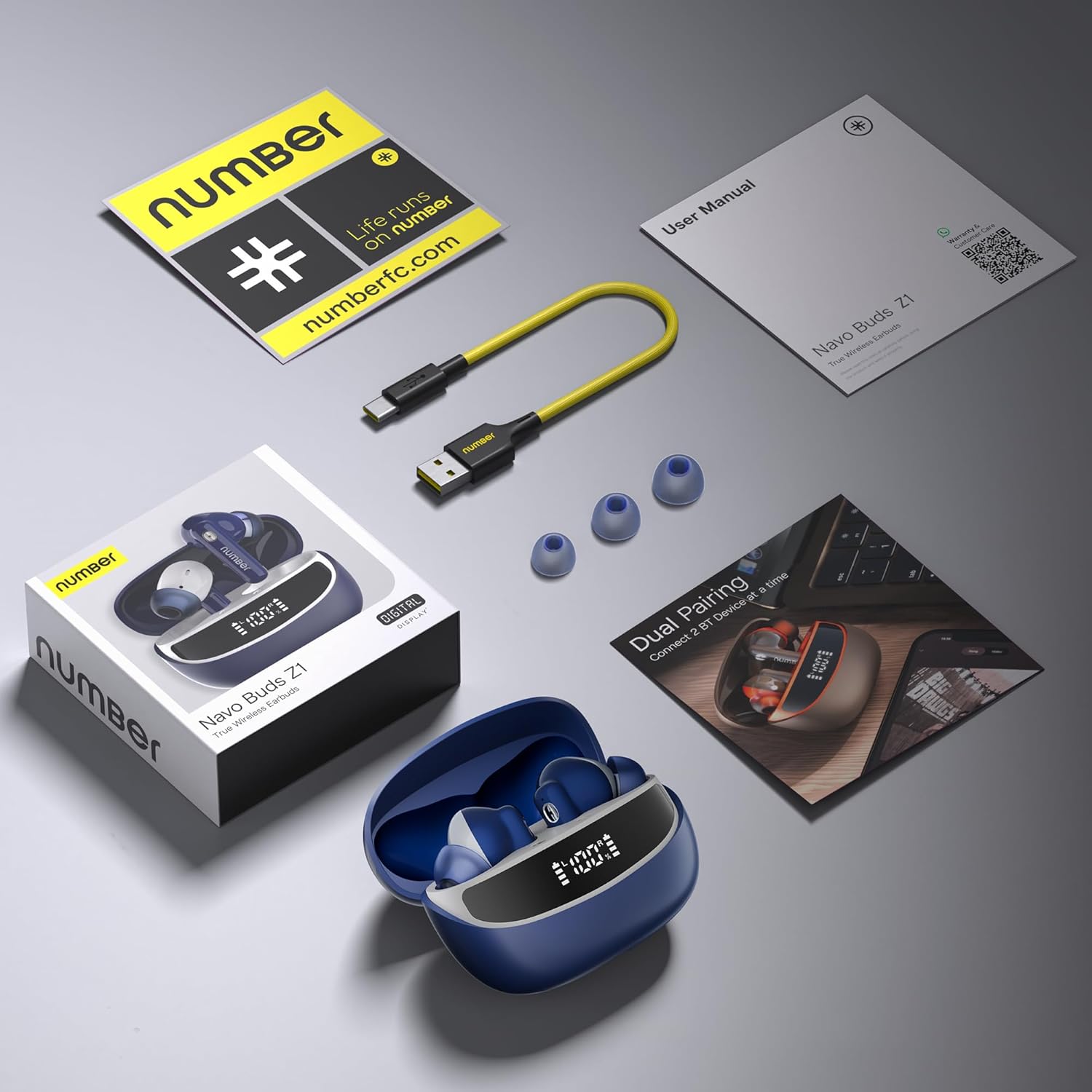 Number Navo Buds Z1 TWS Earbuds | 72H Playtime | Digital Display Case | Quad-Mic ENC | Dual Pairing | Hi-Bass 13mm Drivers | Quick Charge | 35ms Low Latency | IPX5 | Touch Controls | (Winter Blue)