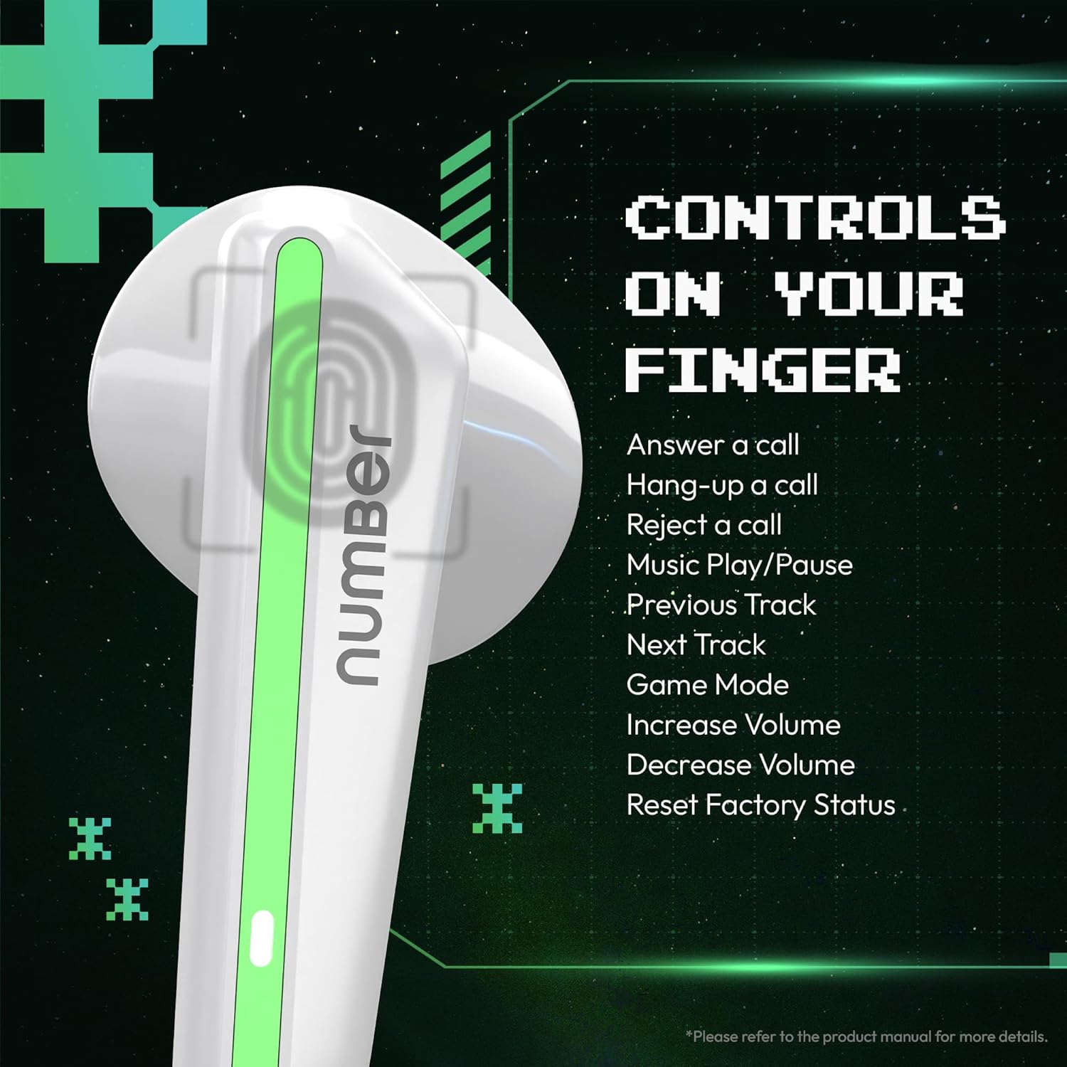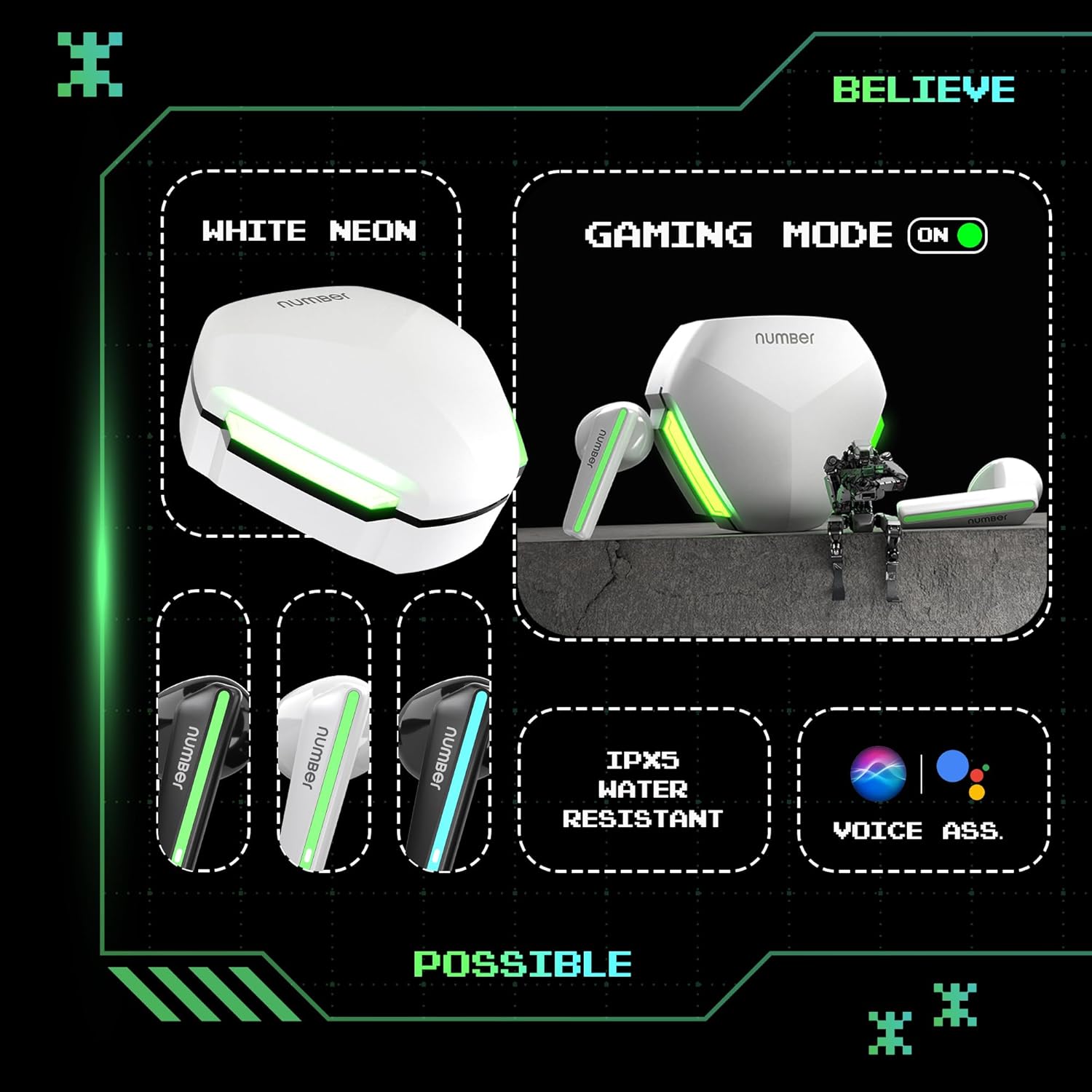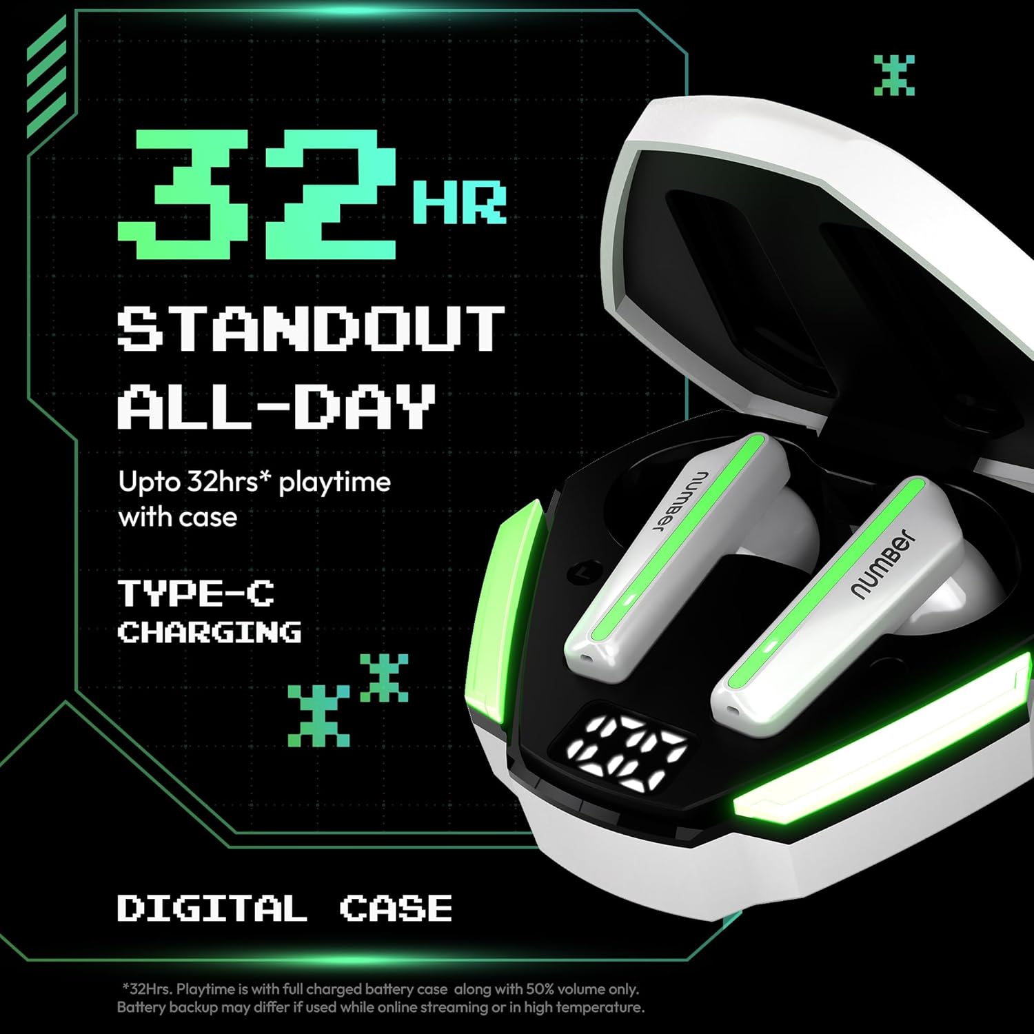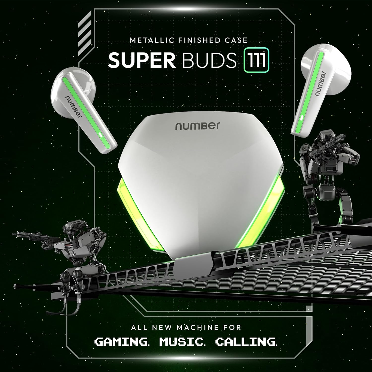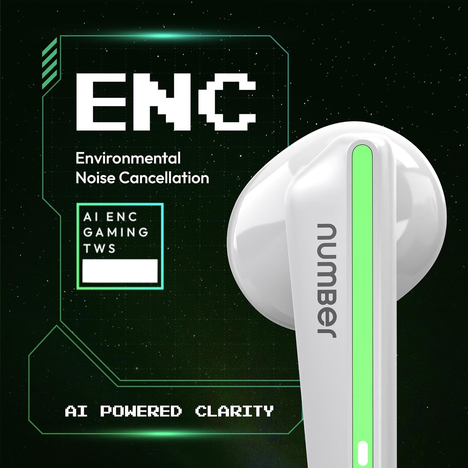 Number Super Buds 111, AI ENC Gaming TWS Earbuds, Low Latency 45MS, Upto 32Hrs Playback Bluetooth (White Neon)
