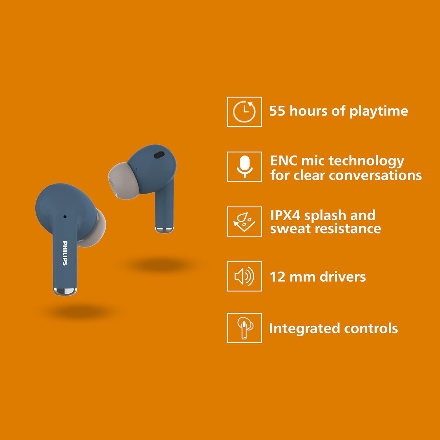 Philips Audio TAT1169BL/94 True Wireless in Ear Earbuds with Pocket Sized Charging Case, Play Time Upto 55Hrs, 12mm Dynamic Drivers, Inbuilt Mic, IPX4 Splash & Sweat Resistant (Blue)