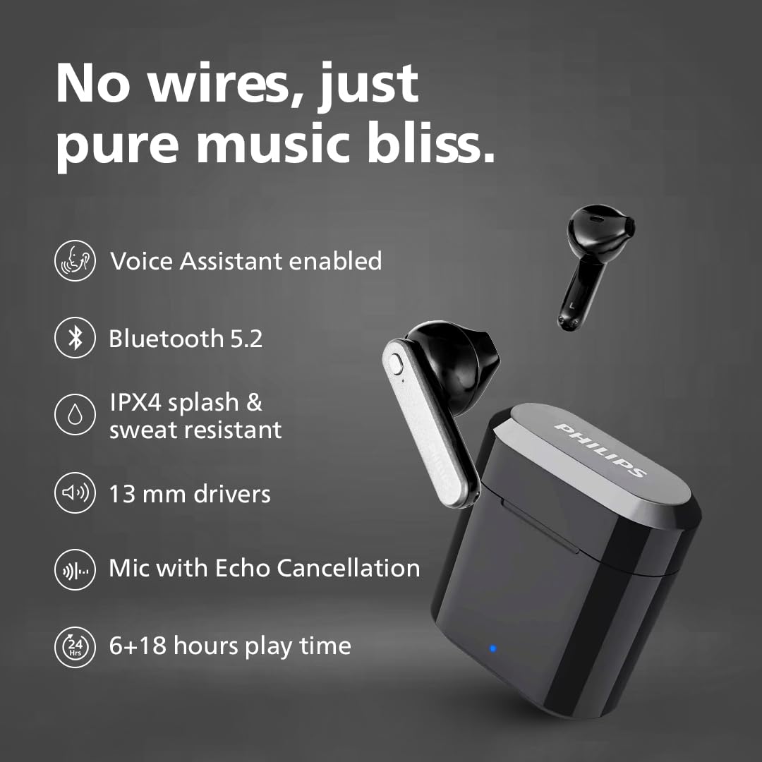 PHILIPS Audio TWS TAT3225/94 True Wireless Earbuds with 24 Hour Playtime (6+18), IPX4 Splash- and Sweat-Resistant, Bluetooth V5.2, Smart Pairing, 13 mm Drivers, Voice Assistant (Black)