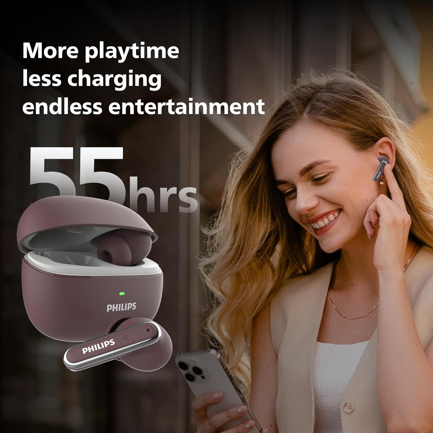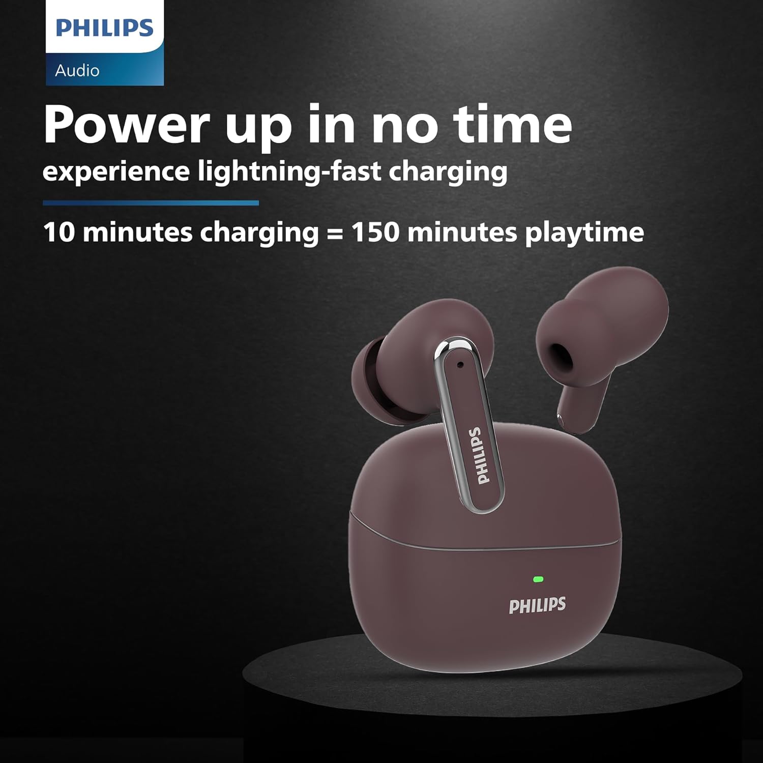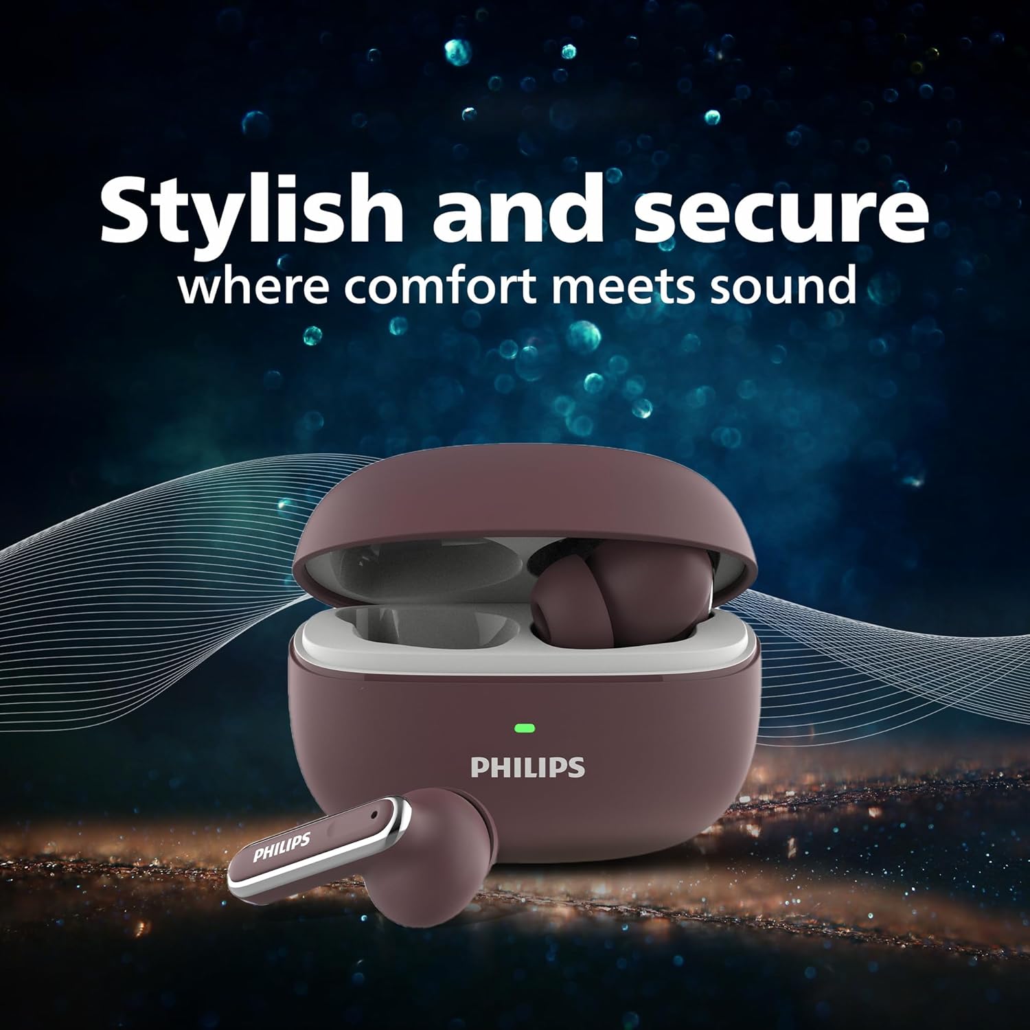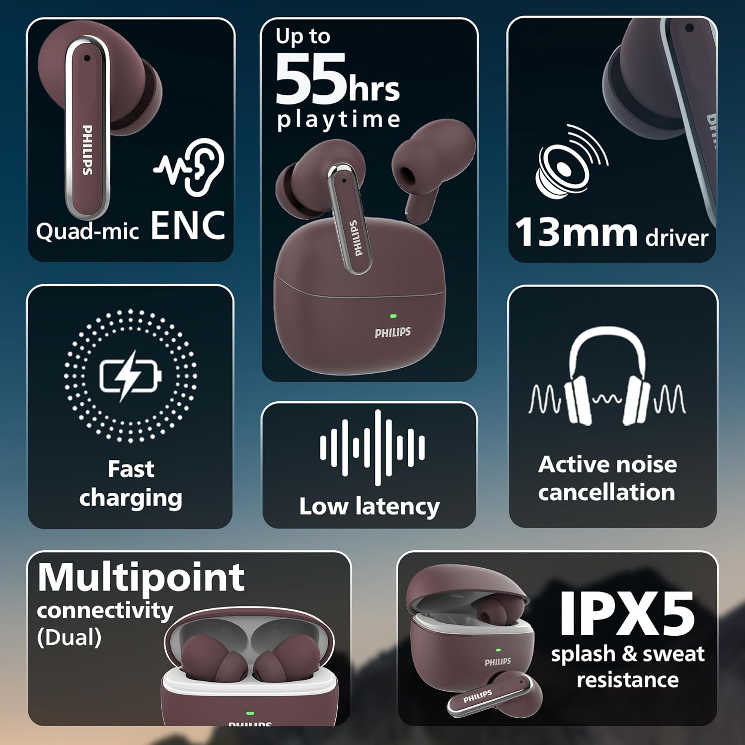 Philips TAT1150RD/94 Premium Wireless Earbuds with ANC,Quad Mic ENC,Up to 55 Hr Playtime,13mm Neodymium Drivers,Multipoint, ergonomically Designed,IPX5 Water Resistance, Fast Charging(Red Mahogany)