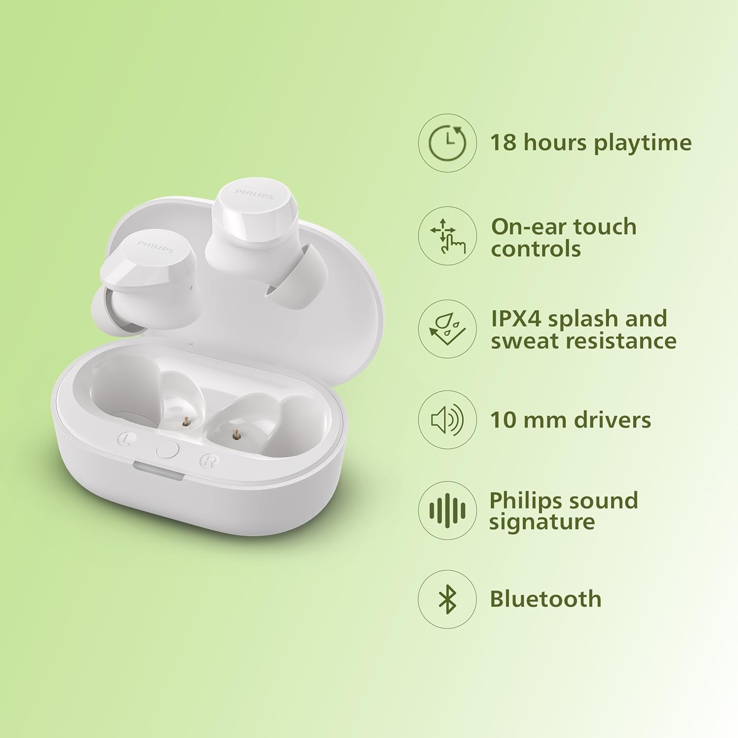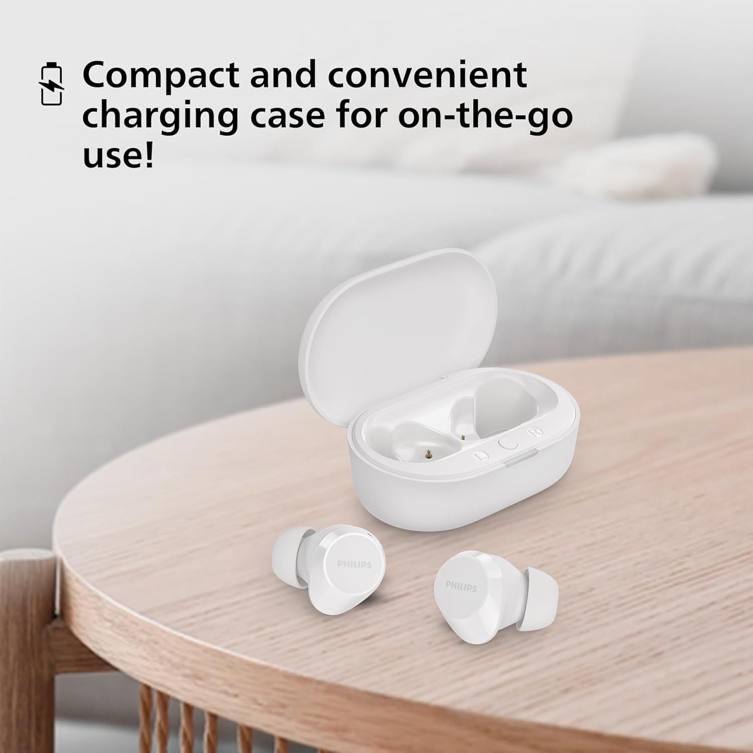PHILIPS TAT1209WT/00 True Wireless Earbuds, in-Ear Active Noise Cancelling Bluetooth v5.3 Earphones with Mic, 18H Play Time, Shank Shape, IPX4, Touch Controls & Charging Case for iPhone/iPad (White)
