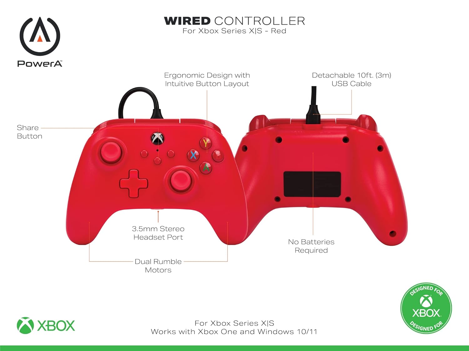 PowerA Wired Gaming Controller for Xbox Series X/S, Xbox One, PC, Windows 10/11, Red (Officially Licensed)