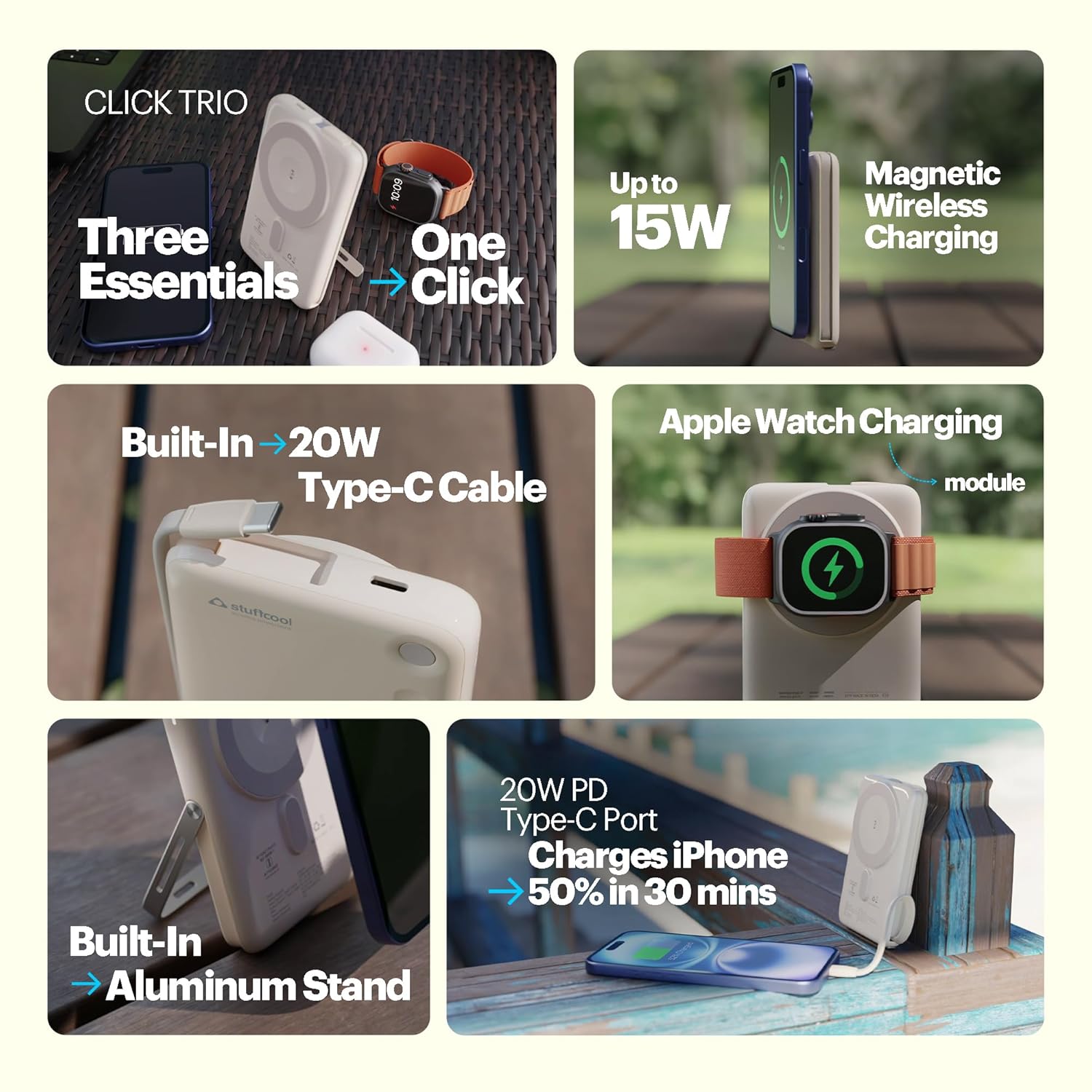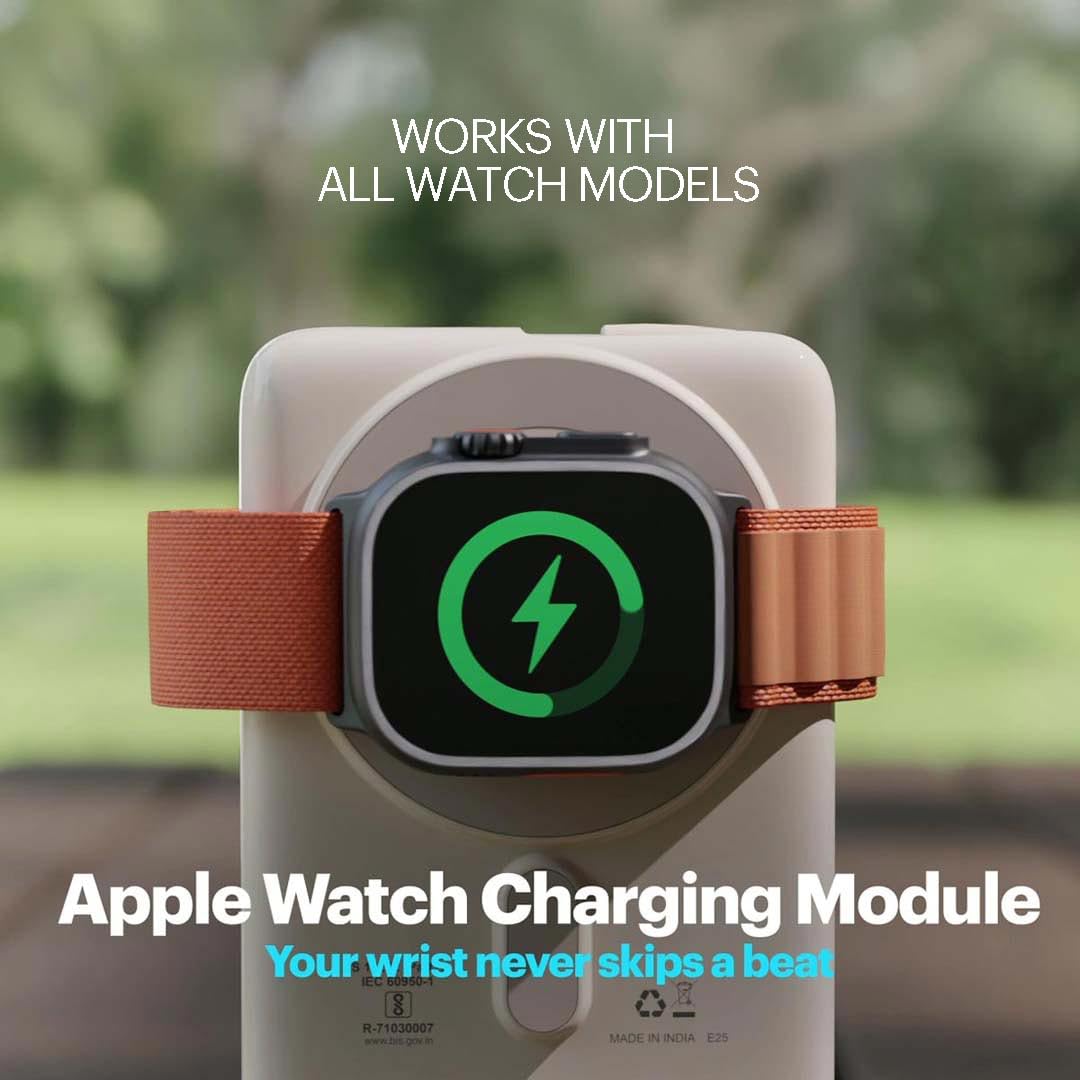 Stuffcool Click Trio 10000mAh Magnetic Wireless Powerbank with Apple Watch Charging Module and Aluminium Stand, 15W Wireless & 20W PD Fast Charging with Built-in Type-C Cable