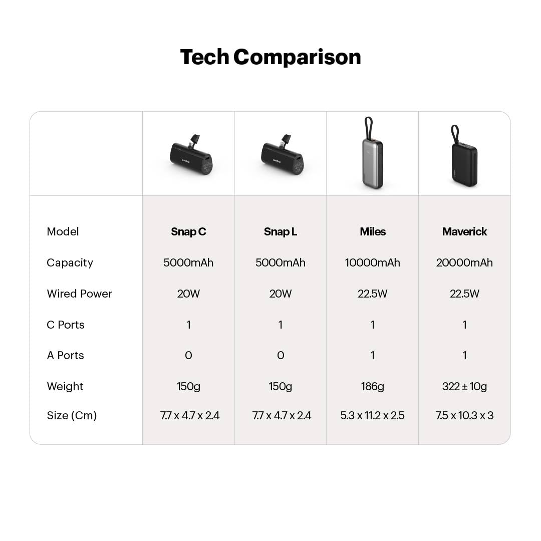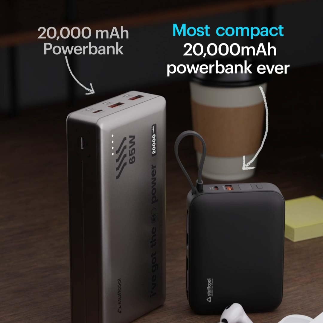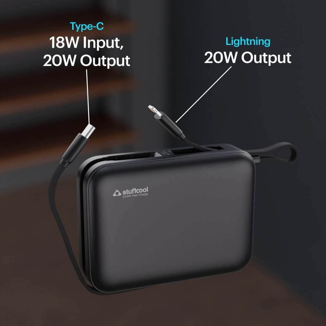 Stuffcool Maverick Mini 20,000mAh Powerbank with 20W Built-in Lightning & Type-C Cables, 22.5W USB-A Fast Charging for iPhone, Samsung, Pixel, OnePlus, Oppo & Realme, Black